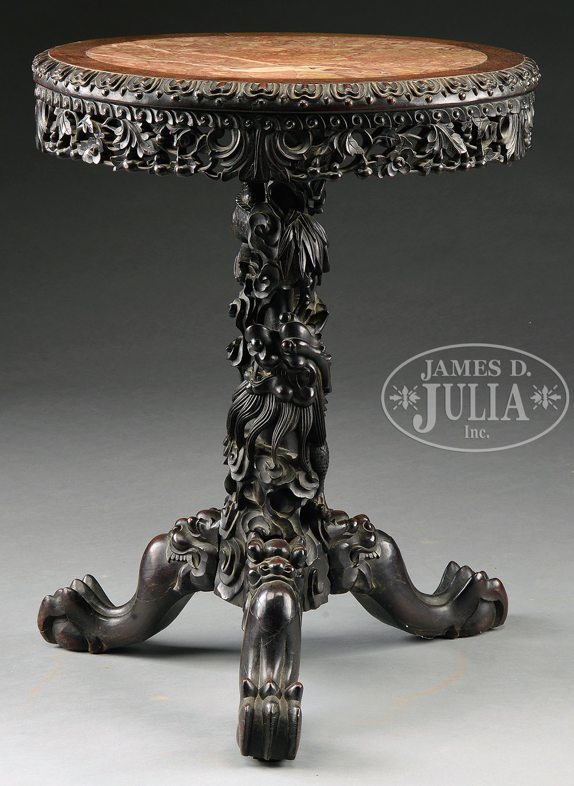 CARVED ROSEWOOD MARBLE TOP PLANT STAND.19th century, China. Circular rose colored breschia marble top within a conforming surround with gadrooned edge above the foliate carved pierced frieze joined to the central shaft carved with entwined dragons raised on a tripod cabriole leg base headed by fanciful masks terminating in bold claw feet. Note: Removable top is joined to standard by wood wedges. SIZE: 30-1/2″ h x 24-1/2″ dia. CONDITION: Retains original surfaces with dark patina. Structurally sound. One leg needs regluing to shaft. 9-94034 (5,000-7,000) – Lot 4443