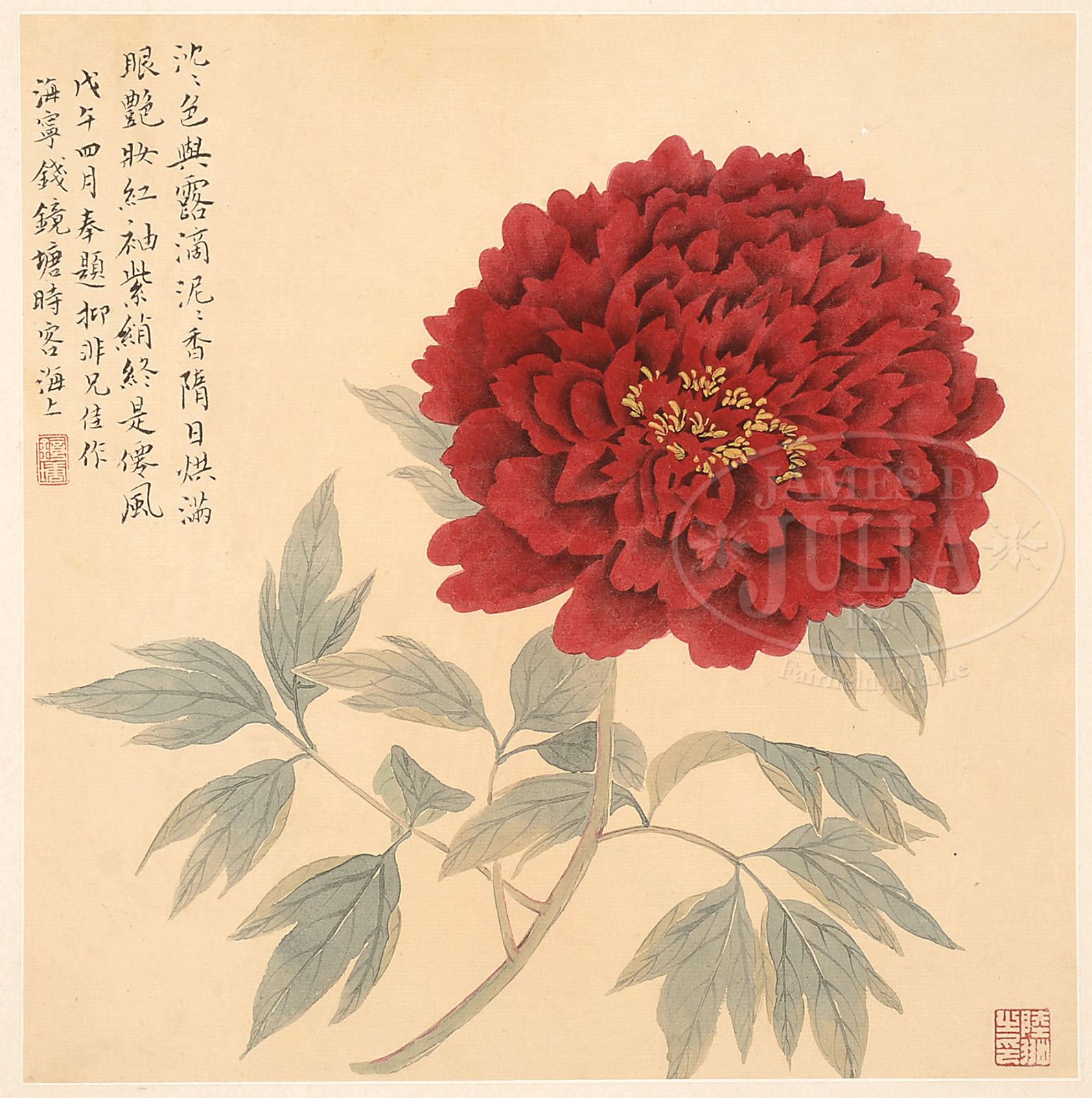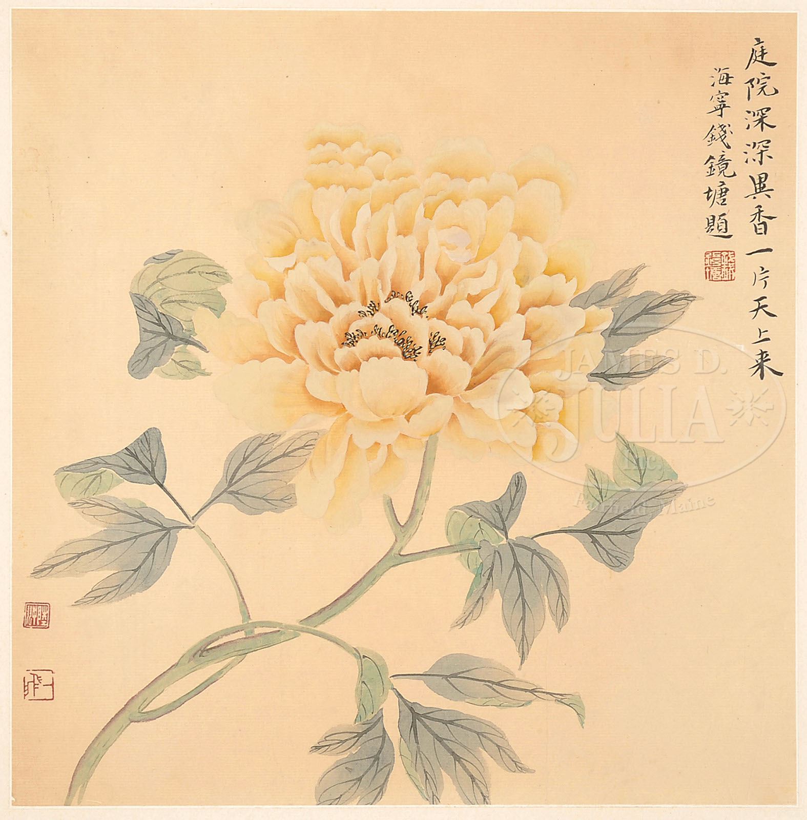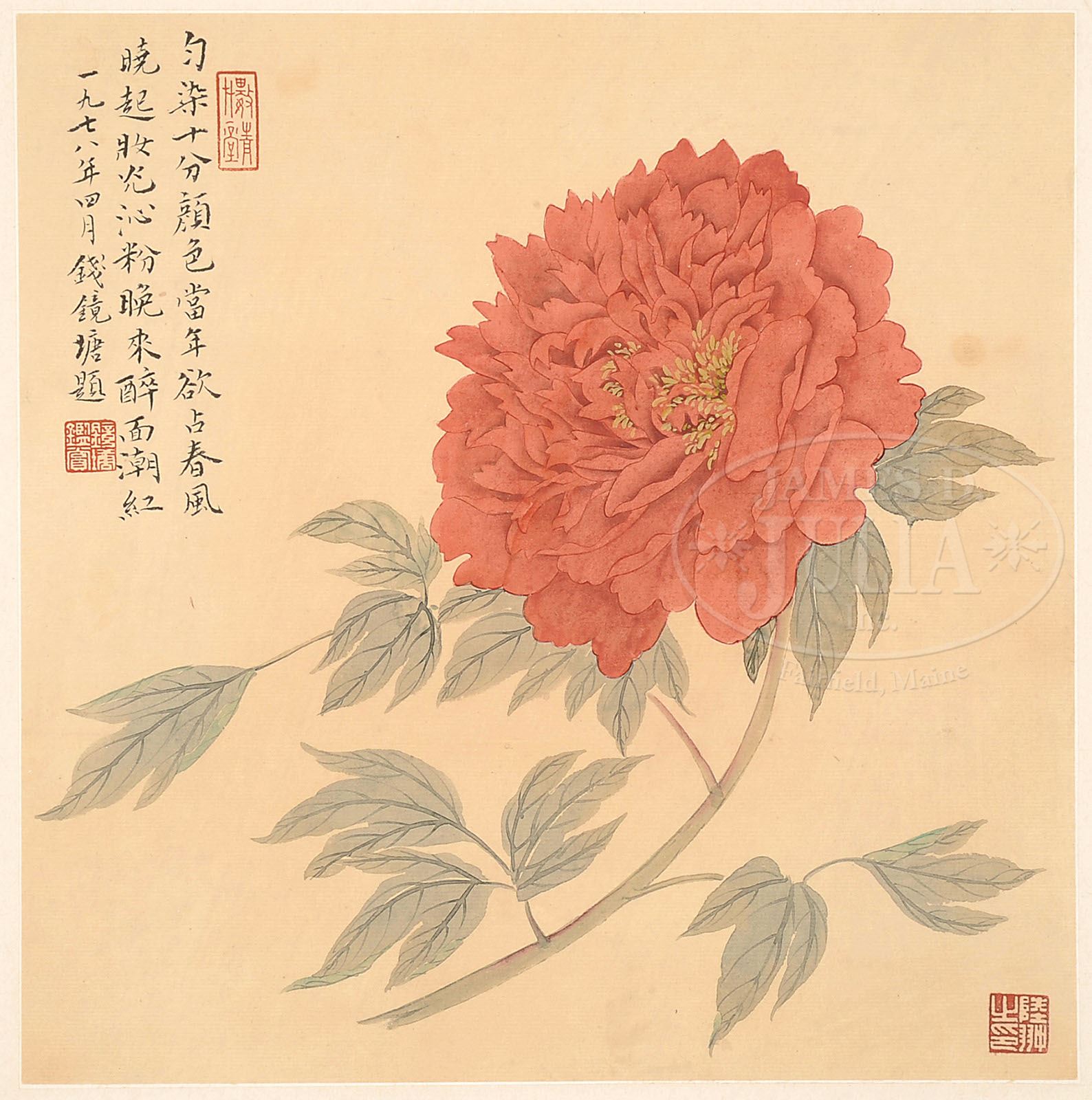 ALBUM LEAVES ATTRIBUTED TO LU YIFEI (1908-1997). China, ink and colors on paper, eight leaves, each leaf finely depicting peony branches, with inscription signed “Qian Jingtang” and dated “wuwu year,” with two or three seals on each leaf. SIZE: 12-1/2″ x 12-1/4″. CONDITION: Good. 9-90825 (1,200-1,500)