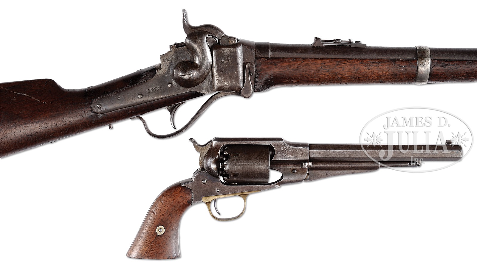 EXTREMELY RARE AFRICAN AMERICAN 9th US CAVALRY “BUFFALO SOLDIERS” ISSUED AND MARKED SHARPS CARBINE AND REMINGTON ARMY REVOLVER.