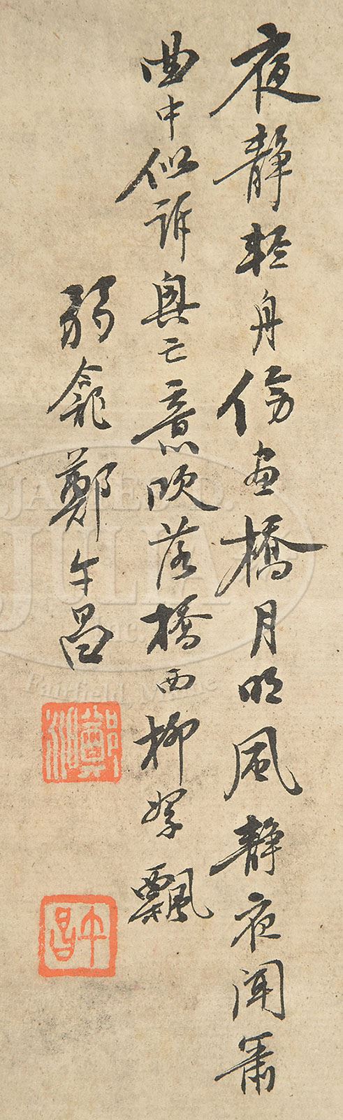 HANGING SCROLL IN THE MANNER OF ZHENG WUCHANG. China, ink and light colors on paper, depicting scholars in a desolate landscape with river and cottages, inscribed, signed “Ruokan Zheng Wuchang,” with three seals. SIZE: 26-3/4″ x 13-1/4″. CONDITION: Fair condition, creases, foxing 9-92424 (400-600)