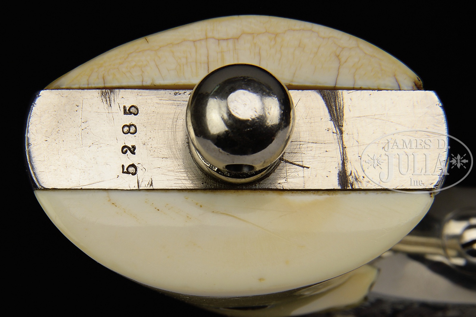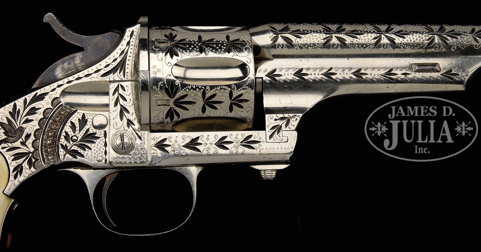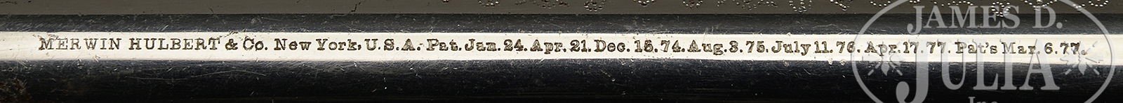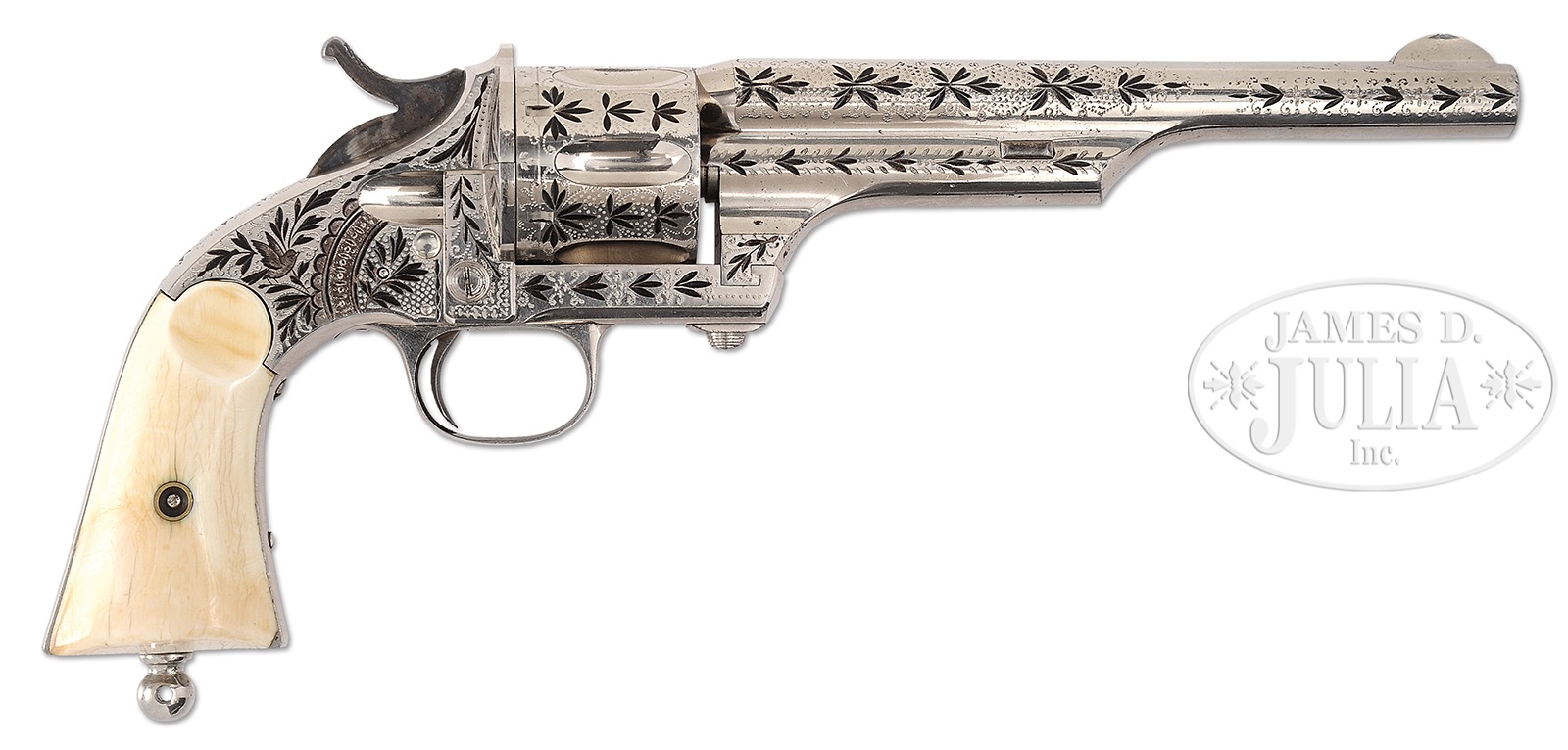 EXTRAORDINARY FACTORY ENGRAVED MERWIN AND HUBERT FIRST MODEL ARMY REVOLVER WITH IVORY GRIPS AND MEXICAN PITIADO HALF HOLSTER.SN 5285. Cal. 44 M&H. 7″ bbl. Factory engraved with full nickel finish and 2-pc ivory grips. Revolver was engraved by Otto Bodenstein with meandering scroll work and rustic representations of animals, which are a hallmark of Merwin & Hulbert products. The floral accents are inlaid with a black enamel to provide contrast. Left side of frame is engraved with a Mexican eagle motif. Right side of frame shows a small bird. Backstrap is engraved behind hammer. Bottom of butt and trigger guard are plain. Bbl is engraved at breech-end, running all the way to muzzle. Cyl is engraved between flutes. Bbl shows correct 1-line Merwin & Hulbert mark with last patent date of March 6, 1877. Left side of bbl shows the Hopkins & Allen address. SN is stamped on butt behind lanyard loop stud. Loop is missing. Assembly no. “3112” is stamped on lower frame under rip. Assembly no. also appears on cyl arbor, rear face of cyl, and rear face of bbl lug. Left inside of grip shows no. “7955” in pencil. Pitiado holster is of the half length variety with decoration on front face and hold-down strap. Holster is lined. Accompanying this revolver is a letter from Peter A. Underwood of Jim’s Firearms of Baton Rouge, Louisiana, dated April 19, 2009, where he gives attribution to General Porfirio Diaz of Mexico. Special Note: This item(s) contains plant or animal properties that may be covered by the Endangered Species Act (ESA). We have taken care to ensure that this item(s) meets the standard for sale under the ESA. However, certain states and other countries have laws that are more restrictive than the ESA. It is the bidder’s responsibility to ensure that it is lawful to purchase or transport this item(s) into their state, and to obtain the necessary import and export approvals. Delay or failure to obtain any such permit or approval does not relieve the buyer of paying for the item(s) and consummating the purchase. CONDITION: Excellent. Revolver retains nearly all of orig nickel finish with sharp markings and engraving. Bore appears unfired. Cyl chambers also appear unfired. Hammer shows a generous amount of case color. Trigger shows traces of fire-blue. Grips are fine with only a small chip out of toe on right side. Holster is also very fine with a light russet brown finish and only a slight break at toe of hold down strap. Lining is in tact. Decoration is not frayed. An excellent example of a First Model Army Merwin & Hulbert Patent revolver with orig engraving in a wonderful rig. 51033-46 (18,000-35,000) IVORY – Lot 4455 Click here to view provenance