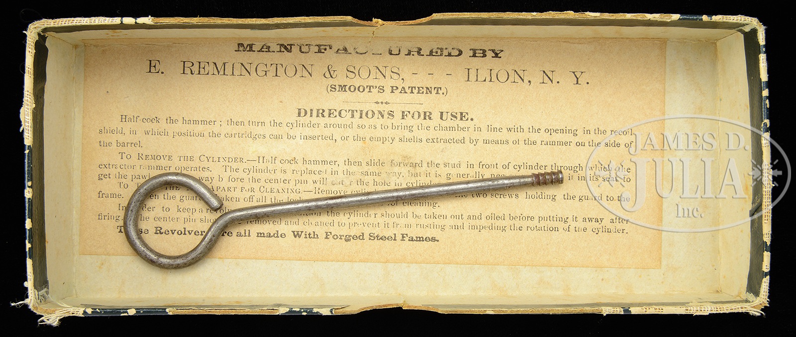 RARE FACTORY DELUXE ENGRAVED REMINGTON SMOOT IN ORIGINAL BOX WITH PEARL GRIPS.SN 212. This early Remington Smoot revolver was made about 1880 in near new condition retaining virtually all its original nickel finish, fine pearl grips and fire blue finish to trigger and screws. Dark green box has printed directions pasted inside and the original cleaning rod. This little gem glistens like a piece of jewelry. CONDITION: Excellent overall. Small area of pitting around frame at bbl pivot and couple small chips in nickel on butt. Gun appears un-fired, mechanically fine with crisp, shiny bore. Lid to box is missing some of its dark green veneer with several scuffs and cracks. 50412-49 JS (6,000-8,000) – Lot 4457