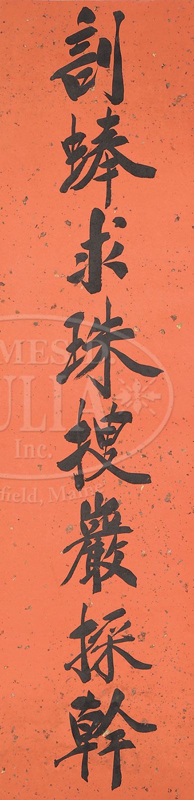 TWO SETS OF CALLIGRAPHY COUPLETS. China. In the manner of Zheng Xiaoxu, cursive script on gilt red paper, inscribed, signed “Zheng Xiaoxu,” with two seals.2) with standard script on gilt paper, signed “Zheng Xiaoxu,” with two seals. SIZE: 1) 58″ x 14-1/2″. 2) 66-1/2″ x 14-3/4″. CONDITION: Good. 9-92445 (700-900)