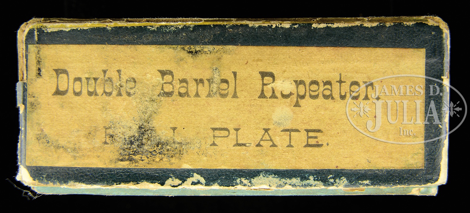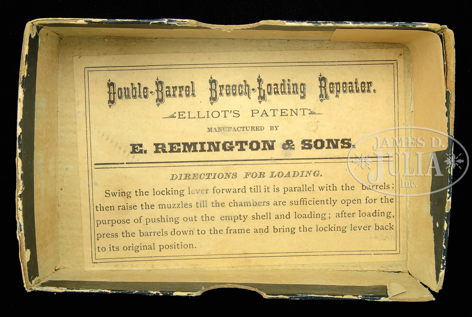 Please Note: The nickel finish is an old in period refinish. RARE BOXED FACTORY ENGRAVED REMINGTON MODEL 1 FIRST VARIANT DOUBLE DERRINGER.SN 2067. Cal. 41 RF. Nickel finish with 3″ superposed bbls, fixed sights with early style markings on side ribs “ELLIOT’S PATENT DEC. 12th” and “E.REMINGTON & SONS, ILION N.Y.”. Extractor is in left side rib. Mounted with 2-pc smooth pearl grips that are numbered “5779” inside each grip. Pistol is engraved with nearly full coverage foliate arabesque scrolls with foliate & floral engraving on frame. Backstrap is engraved with snake & dot patterns around hammer slot. A large flower blossom behind hammer slot with snake & dot borders down the backstrap and geometric patterns on the butt. Accompanied by an orig 2-pc Double Derringer box with dark green lid that has an end label marked “DOUBLE BARREL REPEATER / FULL PLATE”. Inside the lid has a “DIRECTIONS FOR LOADING” label. Bottom of box is a blue/green color with a couple of minor repairs. According to Flayderman’s Guide to Antique American Firearms only about 100 of these derringers were produced in the period 1867-1868. Few of these derringers were ever engraved and even fewer boxes survive today. PROVENANCE: Ex-Robert Howard Estate Collection. CONDITION: Fine to very fine, all matching except grips as noted above. Overall retains 85-90% dull orig nickel plating with bare metal on front strap; grips have lightly chipped edges, otherwise are sound with good fire & color. There are 2 hairline cracks in hinge. Mechanics are fine, strong bright bores with moderate pitting. Box has one broken corner and one repaired corner in the top and a couple of repaired seams in bottom. 50412-48 JS (8,000-12,000) – Lot 4462