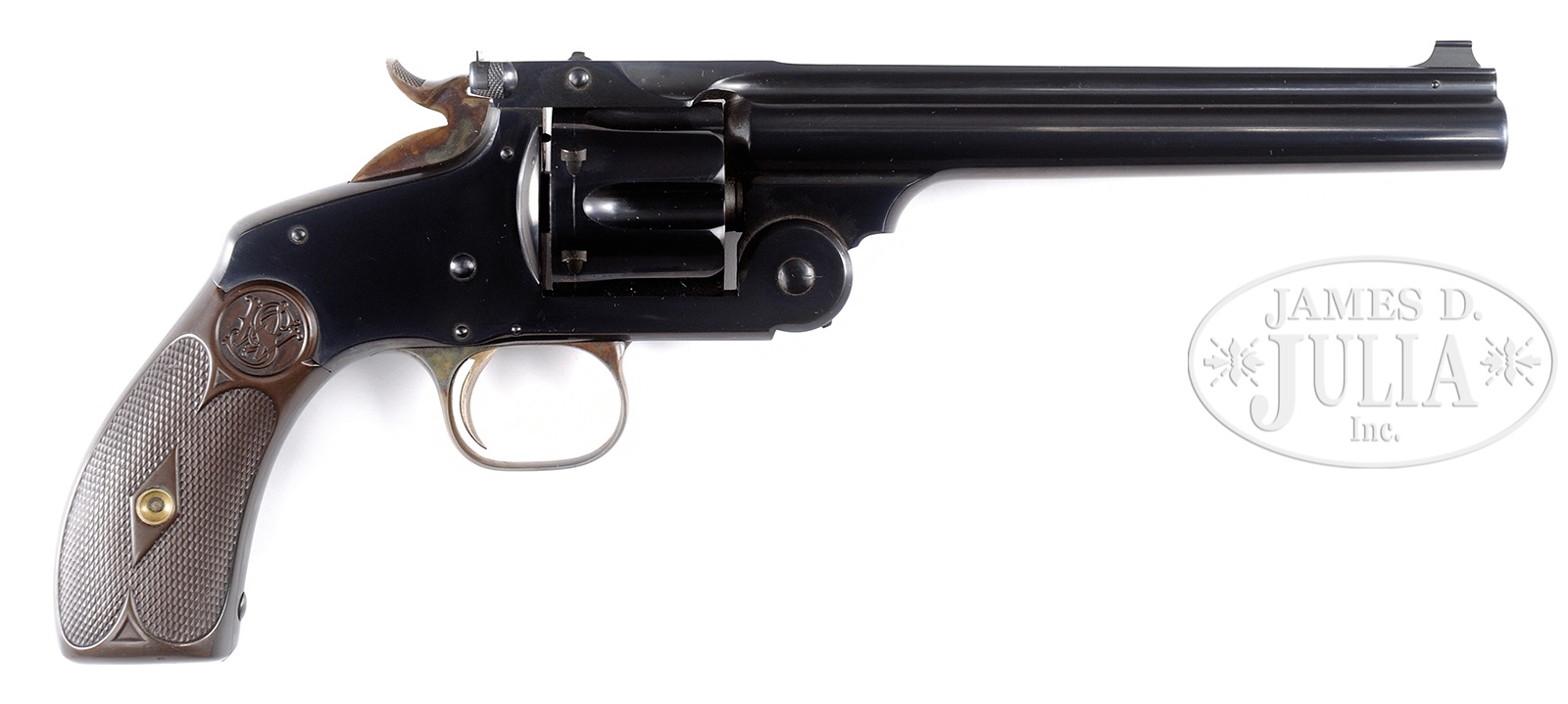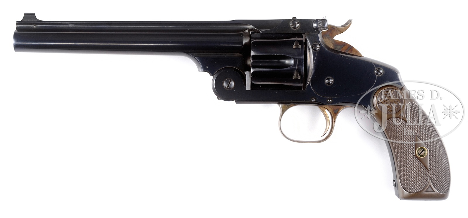 SMITH & WESSON NEW MODEL #3 TARGET SINGLE ACTION REVOLVER IN 32-44 GALLERY CALIBER.SN 27997. Cal. 32-44 GALLERY. 6-1/2″ bbl. Full blue finish. 2-pc checkered hard rubber grips with S&W medallion. Bbl shows correct 2-line Smith & Wesson address and patent mark on top. Frame has SN stamped on butt. SN is also marked on rear of bbl top strap, latch, and rear face of cyl. Grips were not removed because of loose escutcheon in right grip. Bbl has target sights which are correct for this model. Accompanying this revolver is a letter from Smith & Wesson Historian, Roy G. Jinks, that states this revolver was manufactured in 1889 but was open on the records therefore there is no shipping information available. He also states that this revolver was in a group of 50 units, that were completed as target models in both .32-44 and .38-44 calibers. CONDITION: Excellent, as refinished. Revolver shows a professionally re-blued finish overall, with sharp markings and very few handling marks. Bore is dark with visible rifling. Cyl shows rough marks on face rear surface. Chambers are dark. Cyl has a slight drag-mark around rear periphery. Forcing cone of bbl shows pitting under boot. Hammer shows what appears to be generous amount of orig case coloring. Trigger guard also shows a generous amount of case color. Trigger shows a very generous amount of straw color. Grips are fine, slightly under-sized at front strap. Right escutcheon is loose as noted preventing removal of grips. A very attractive Smith & Wesson # 3 New Model Target with professionally restoration. 51033-67 TEP (2,000-4,000) – Lot 4470 Click here to view provenance