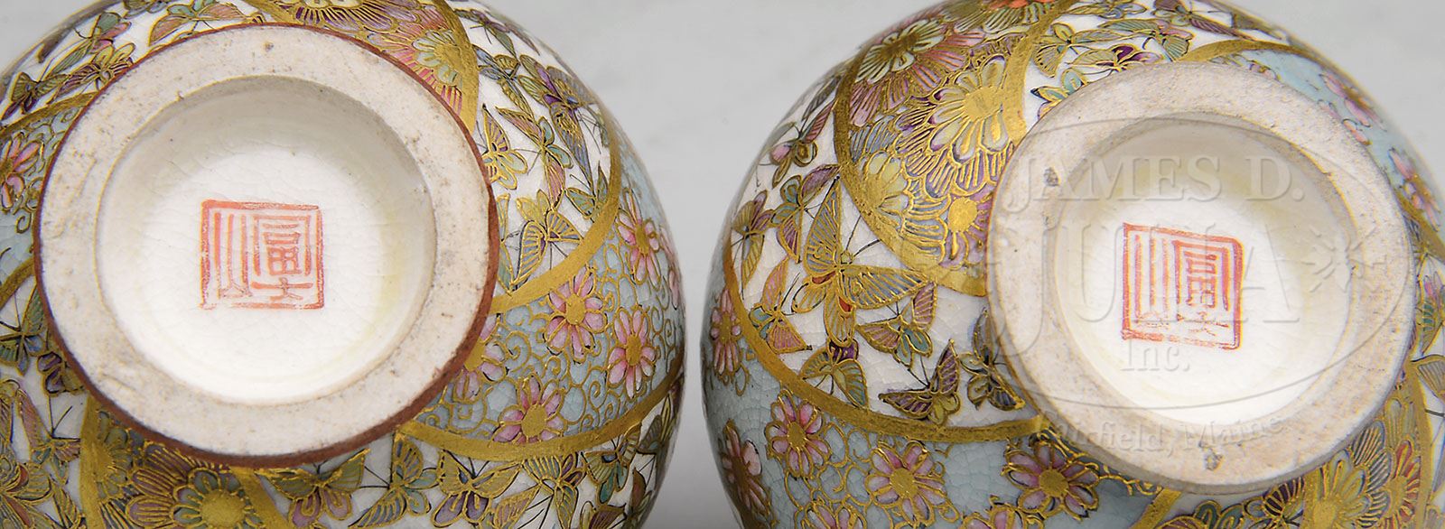 THREE SATSUMA WARE ITEMS. Meiji Period (1868-1912), Japan. Including a pair of small vases, decorated with bands of flowers and butterflies; and a single vase decorated with flowers, butterflies, and painted fan with brocade patterns. SIZE: Pair: 2” dia x 1-1/2” t. Single Vase: 3-1/2” t. PROVENANCE: From a private New York collection. CONDITION: The latter with three small cracks to foot; otherwise very good. 9-25075, 9-25076 (400-600)