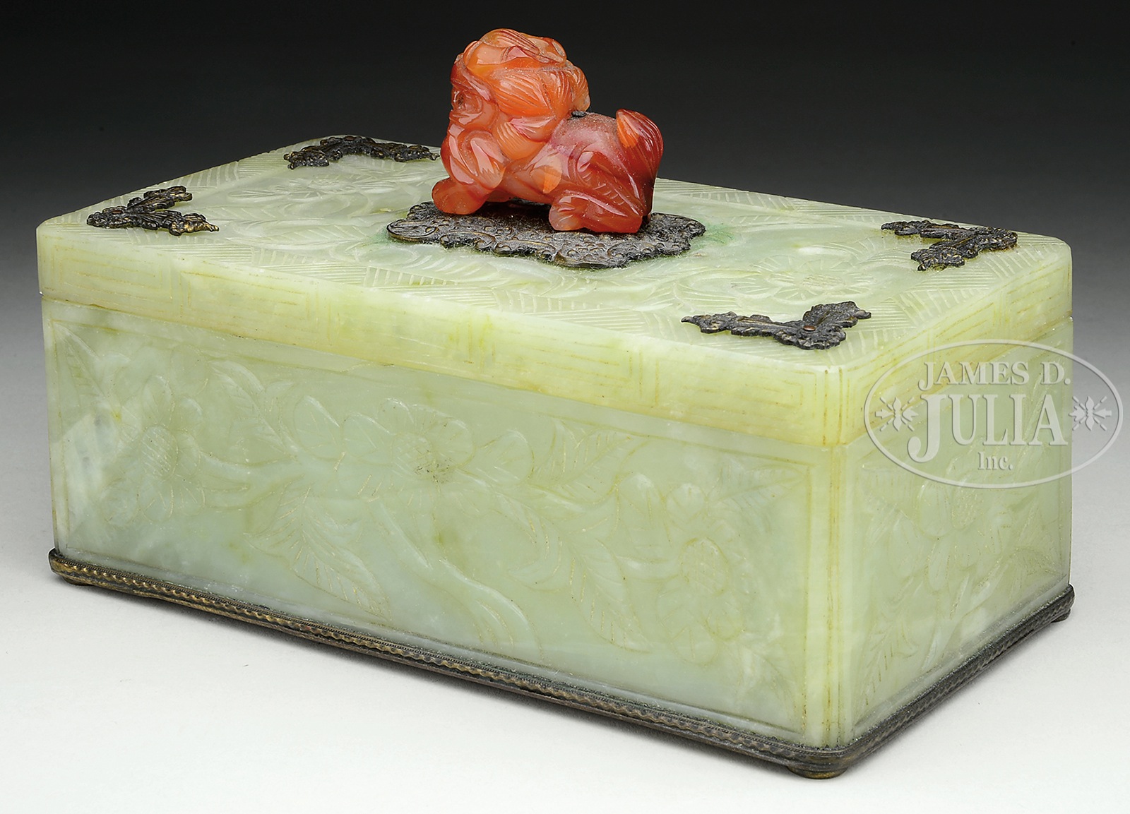 CARVED GREEN SOAPSTONE BOX.Early 20th century, China. Carved in low relief with flowering plants. Carnelian food dog final. European brass mounts. SIZE: 6-1/2″ l x 3-1/2″ w x 4-1/4″ h. CONDITION: With cracks and chips. 7-70701 (200-300) – Lot 4484