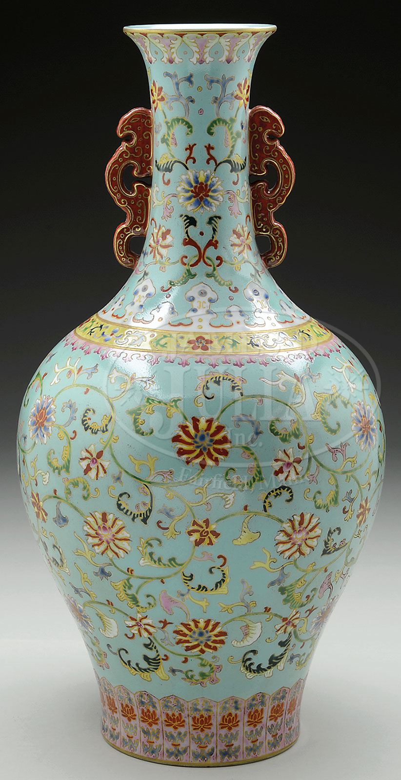PORCELAIN VASE. 20th century, China. Stylized floral scrolling on a turquoise ground. Kuei dragon handles. Ch’ien Lung mark in gold on the base. SIZE: 17-1/2″ t. CONDITION: Very good. 7-70513 (600-800)