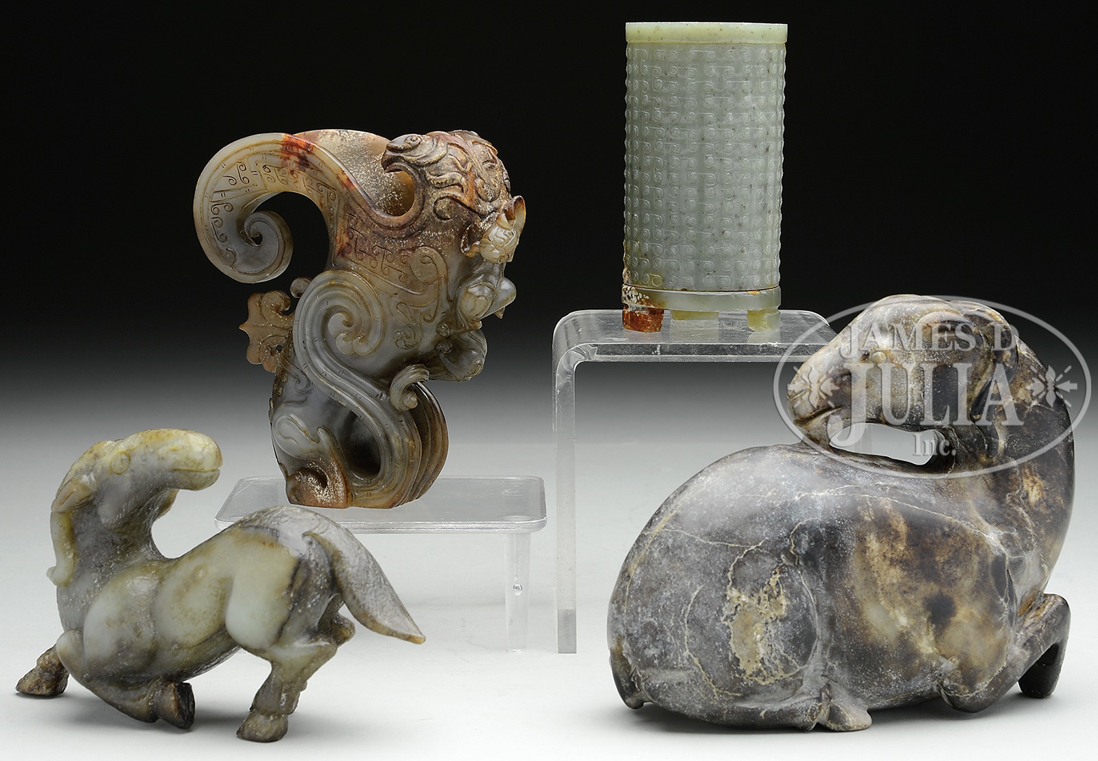 GROUP OF FOUR HARDSTONE CARVINGS.20th century, China. The group includes a carved ram, horse, rhyton, and brush holder. SIZE: Largest: 5-1/2″. CONDITION: Generally good with natural fissures in ram and rhyton. 41988-21, 41988-22, 41988-23 (200-300) – Lot 4489E