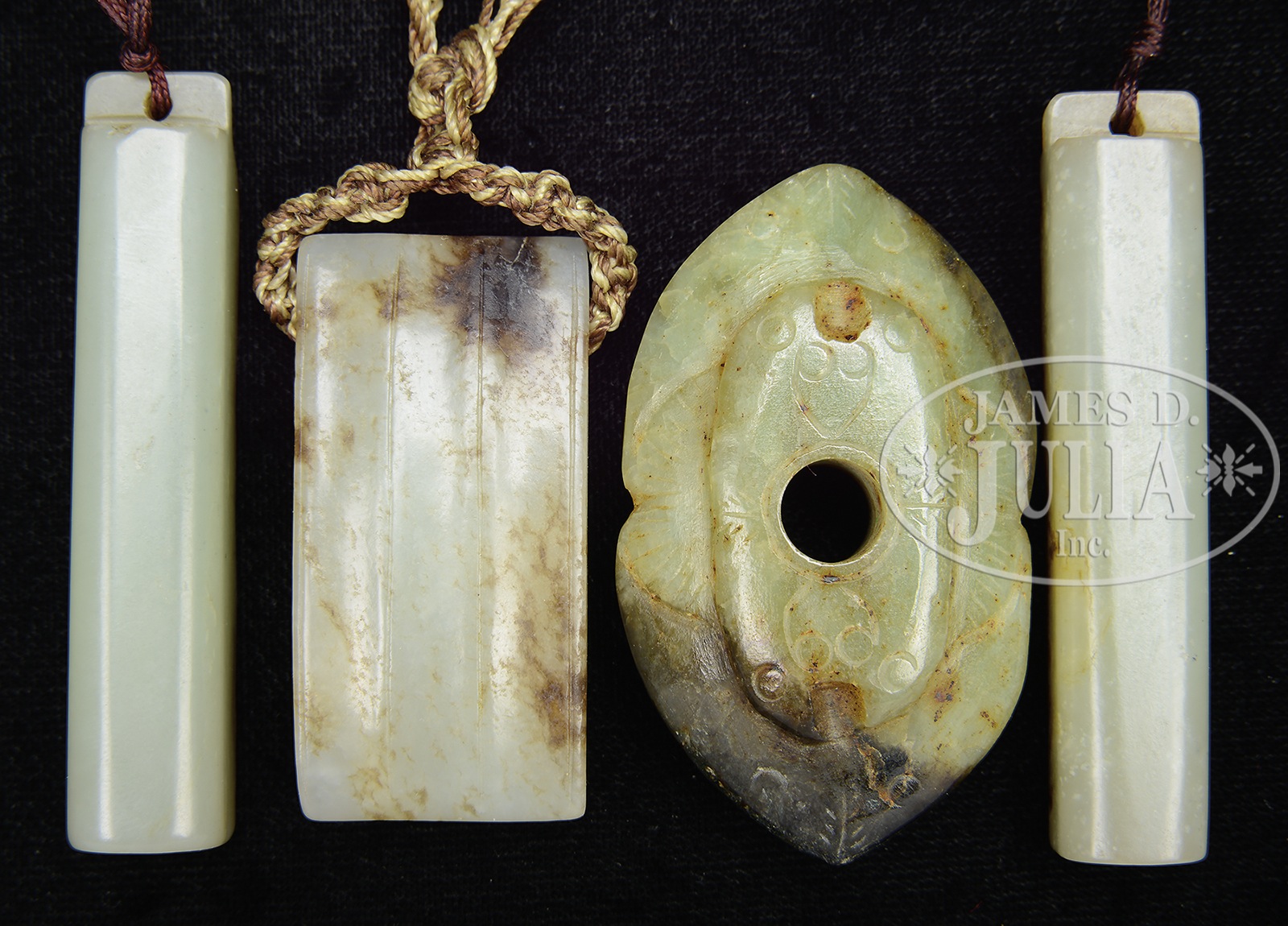 FOUR JADES.19th century, China. Includes two plume holders, a scabbard slide and an archaic style pierced oval pendant. SIZE: Largest: 2-3/4″ l. CONDITION: Very good with typical age wear. 1019-1 (600-800) – Lot 4501