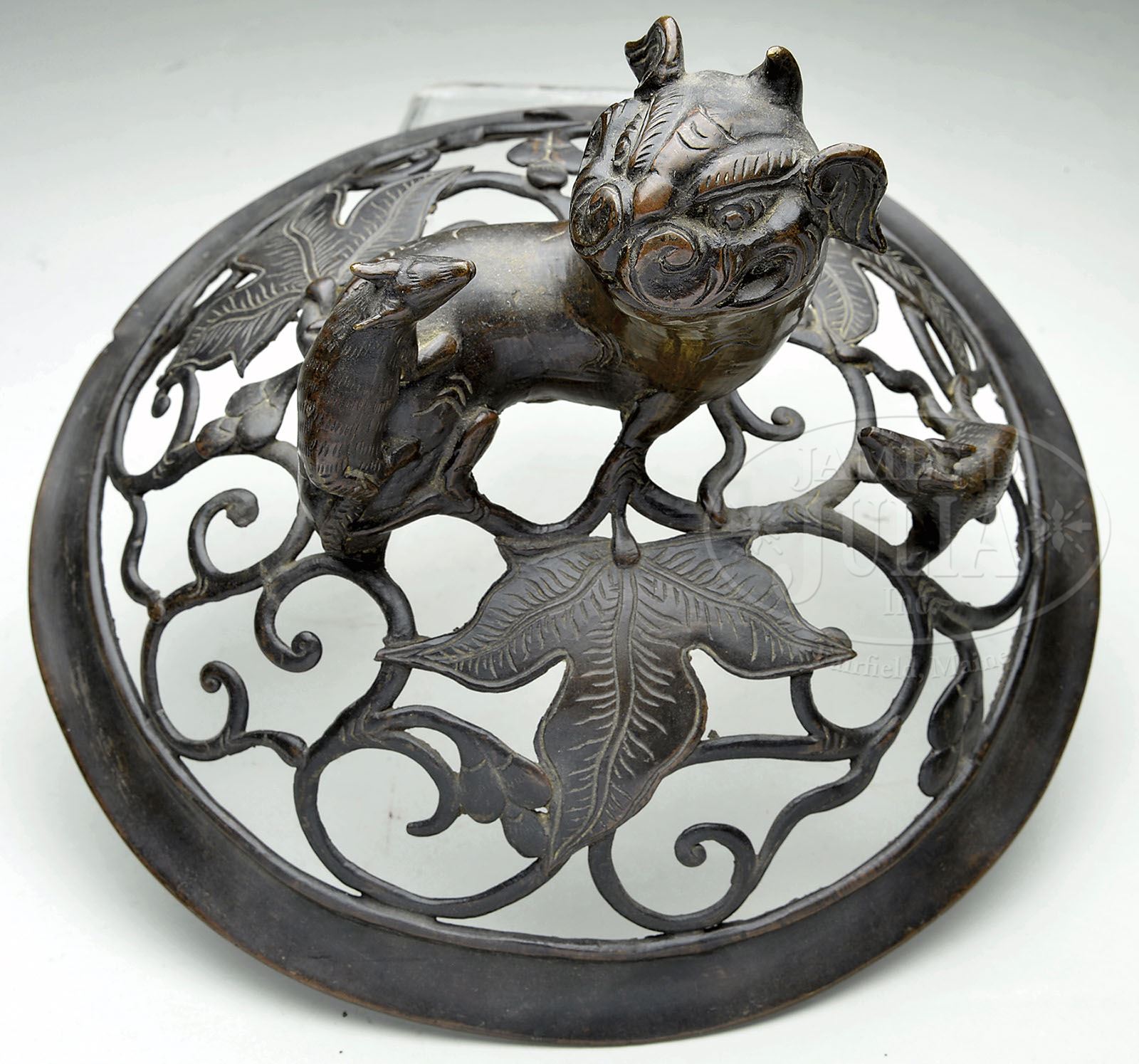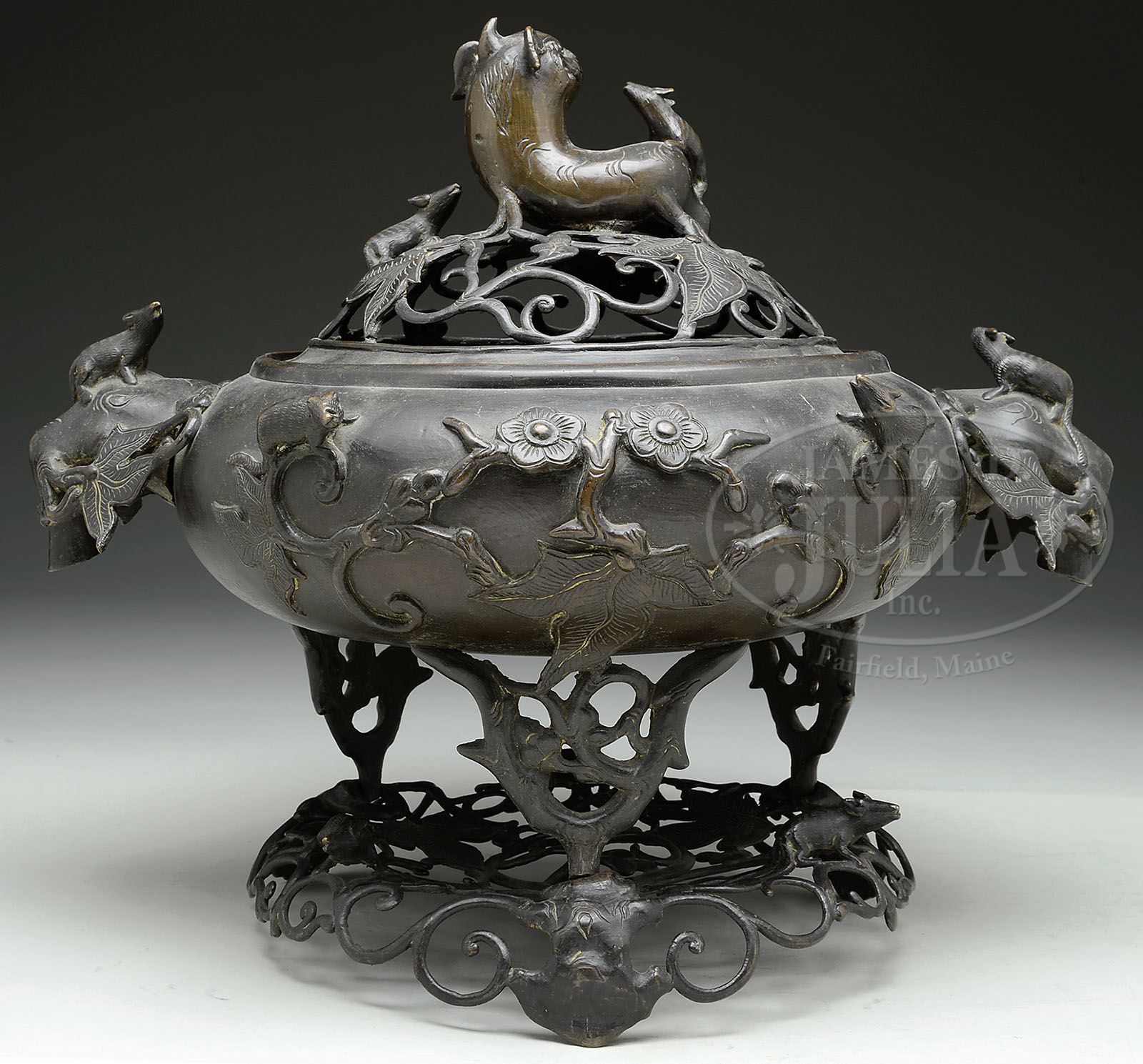BRONZE CENSER WITH STAND AND COVER. 19th century, China. Incense burner cast in high relief with a design of squirrels and foliage. Foo dog finial. Matching cover and stand. SIZE: 17″ w x 14-1/2″ t. CONDITION: Various dents, otherwise good. 7-74188 (400-600)