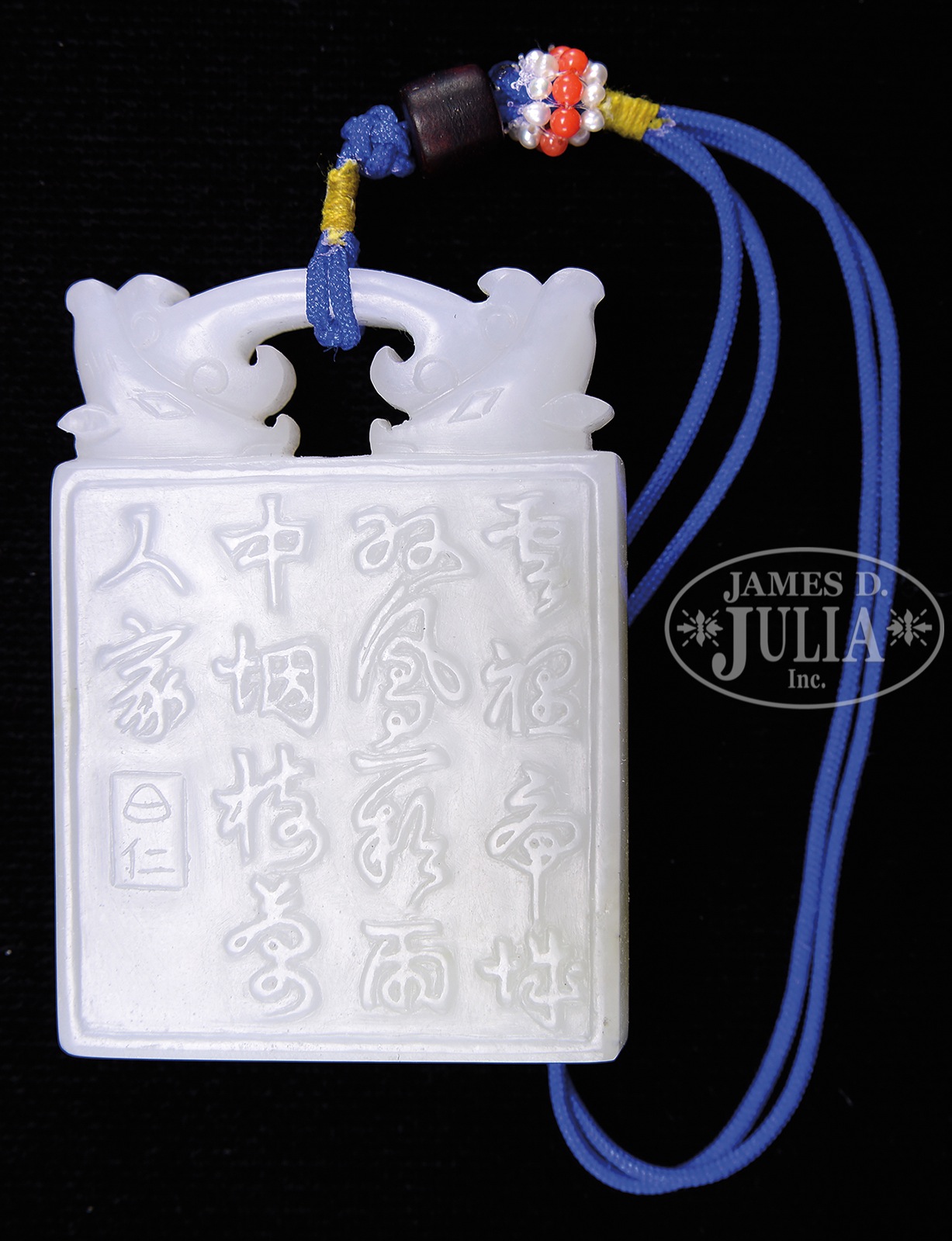 IMPORTANT CARVED JADE PLAQUE.18th century, China. Pure white, highly translucent, rectangular shaped stone. One side carved with a landscape and the other with a 14 character inscription. Detailed with a phoenix head finial. SIZE: 2″ l x 1-1/2″ w. CONDITION: Very good. 9-91174 (3,800-4,500) – Lot 4524