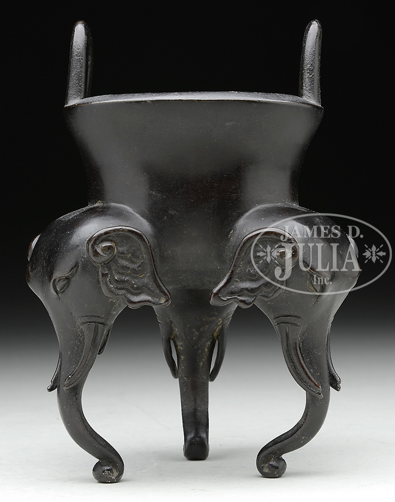 18th century, China. With elephant head feet and strap handles. Deep chocolate brown patina. SIZE: 6-1/4″ h. CONDITION: Handles slightly bent. 48106-5 (400-600) – Lot 4535