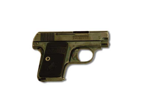 *COLT MODEL 1908 SEMI-AUTOMATIC PISTOL. SN 336226. Cal. 25ACP. 2″ round bbl. Hard rubber grips with silver rampant Colt escutcheons. CONDITION: 90% blue with slight wear on sharp edges, thinning on the top. Brilliant case hardening on trigger, backstrap and safety. The grips are fine. 4-46431 FS159 (250-350)