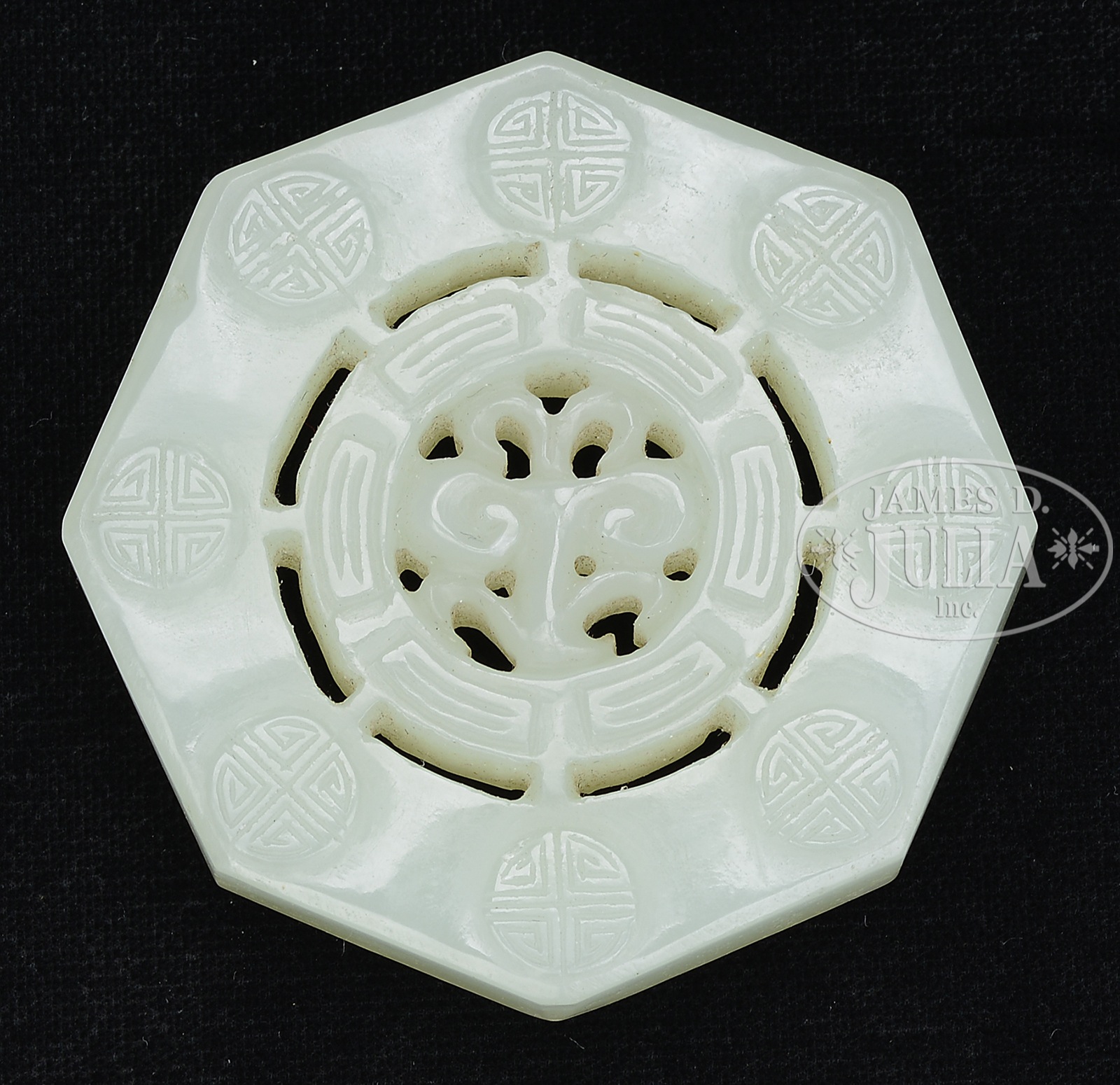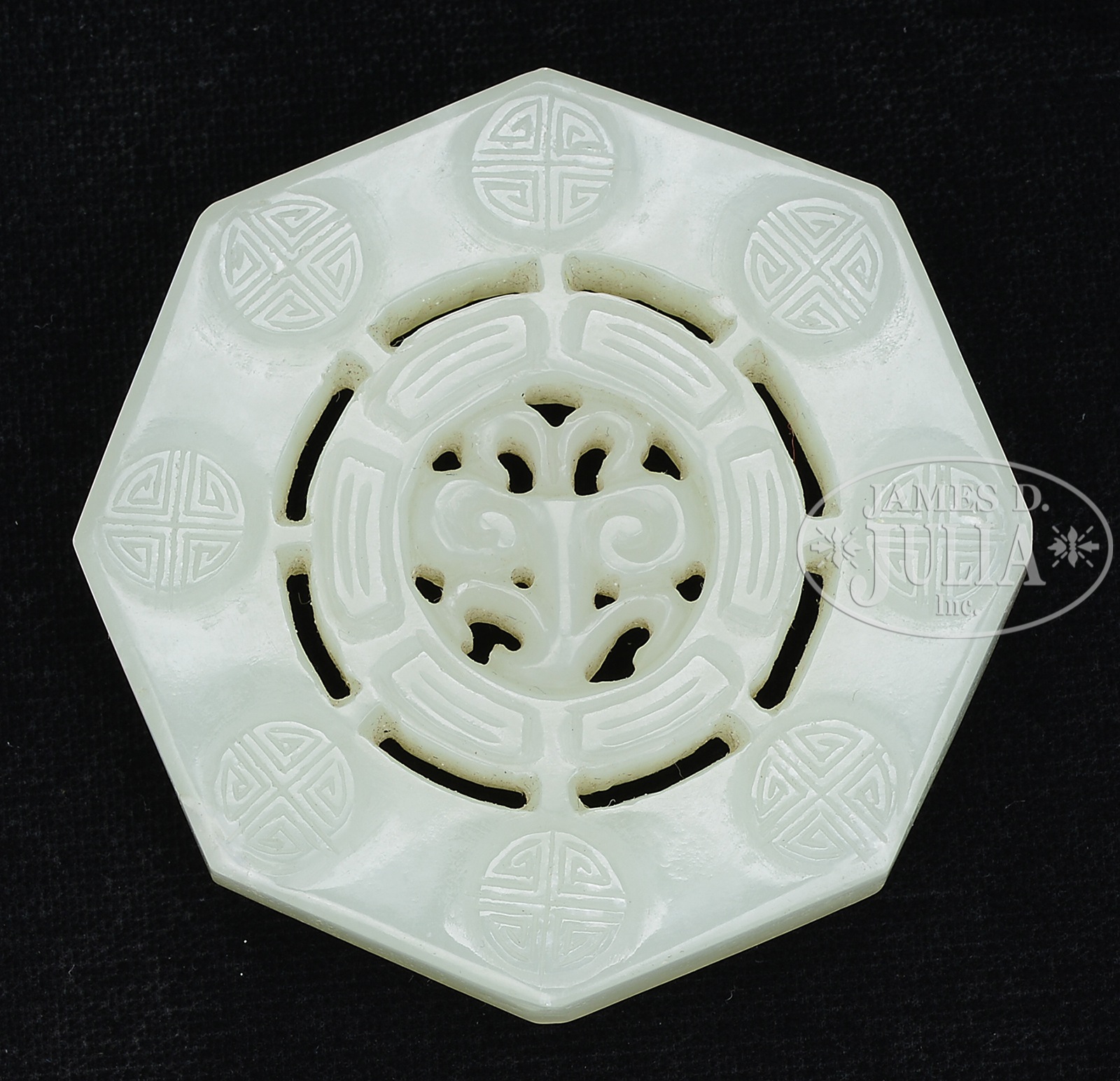 WHITE JADE OCTAGONAL DISC PENDANT.China. Central design of lingzhi fungus. Longevity roundels around the edge. SIZE: 2-1/4″ w. CONDITION: Good. 47964-57 (300-400) – Lot 4556
