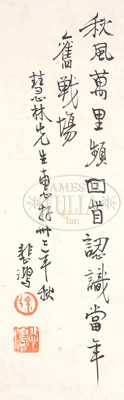HANGING SCROLL IN THE MANNER OF XU BEIHONG.China, ink on paper, depicting a galloping horse, with long inscription, dedicated to Mr. Huilin, signed “Beihong,” dated “Republican thirty-two year,” with three seals. SIZE: 27 ¼” x 17 ¼” CONDITION: Extensive foxing. 9-91448 (500-700) – Lot 4563