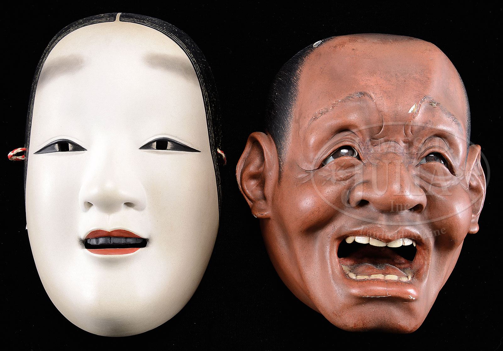 TWO SHAKUMI MASKS. Late 19th/early 20th century, Japan. Carved and painted wood, one with inlaid glass eyes, the other a mask of a court woman. SIZE: Each approx. 9″ l. PROVENANCE: From a private New York State collection. CONDITION: Mask with glass eyes has a large chip to back and some paint flecks. The other one is fine. 9-92612 (300-500)
