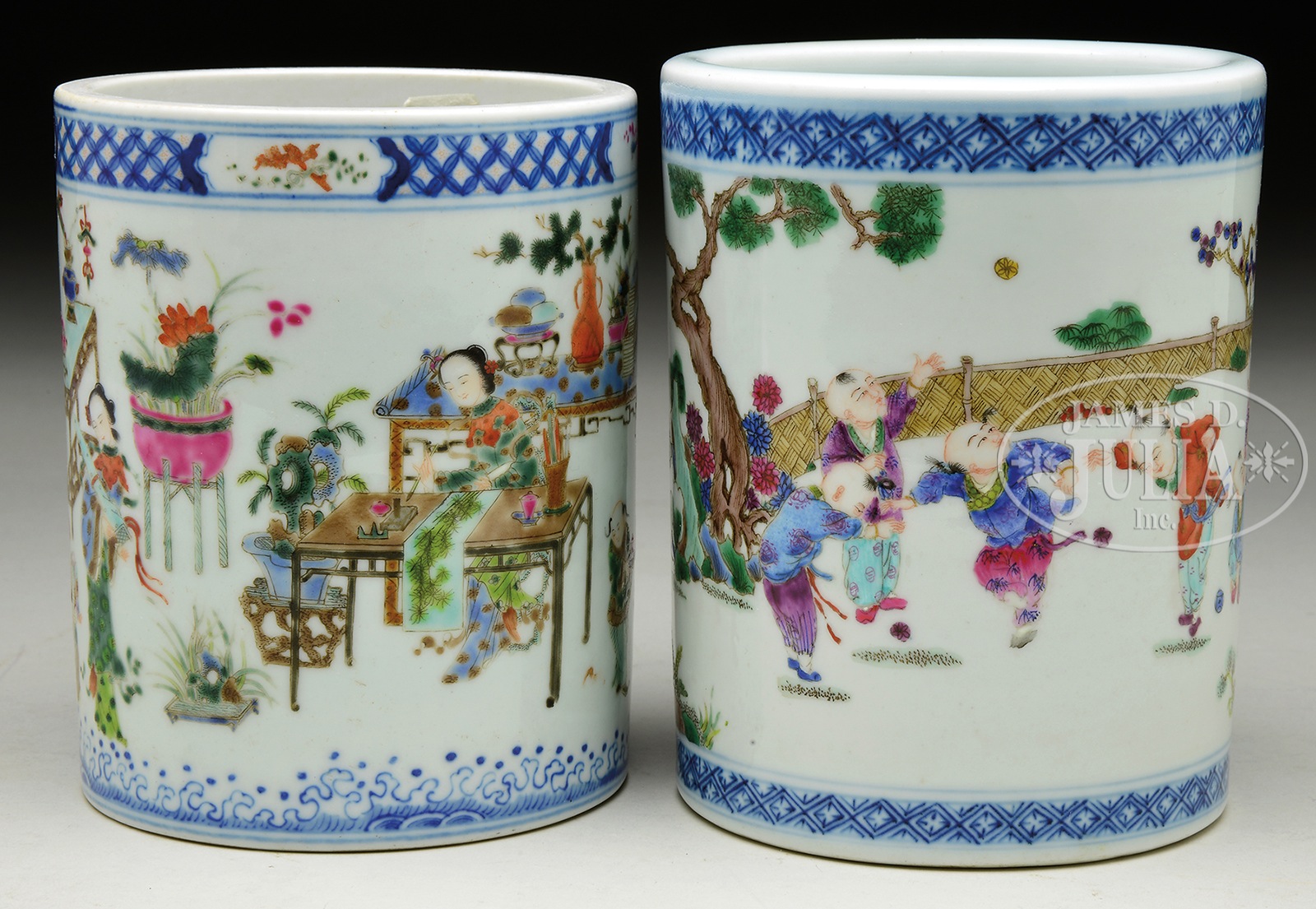 TWO FAMILLE ROSE BRUSH POTS.1930s, China. Underglaze blue and Famille Rose decoration of children playing. Each with 6 character marks. SIZE: Largest is 5-1/2″ h. PROVENANCE: From a fine private Long Island, NY collection. CONDITION: Wear to enamels on both. 9-93378 (300-500) – Lot 4587