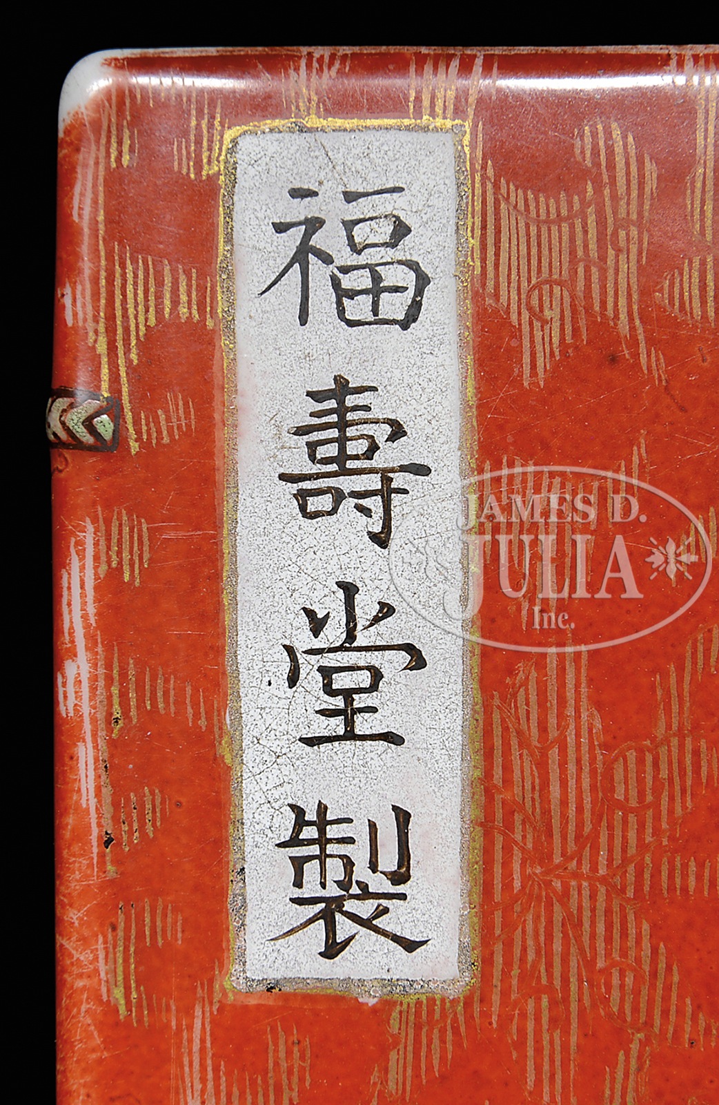 CORAL GROUND FAMILLE ROSE TROMPE L’OEIL BOX AND COVER.China. 4-character Fu Shou Tang mark. Imitating a stack of books with silk thread and gilt design. Interior glazed turquoise. SIZE: 5-1/2″ l. CONDITION: Wear along edges. Overall good. 49143-9 (300-500) – Lot 4587