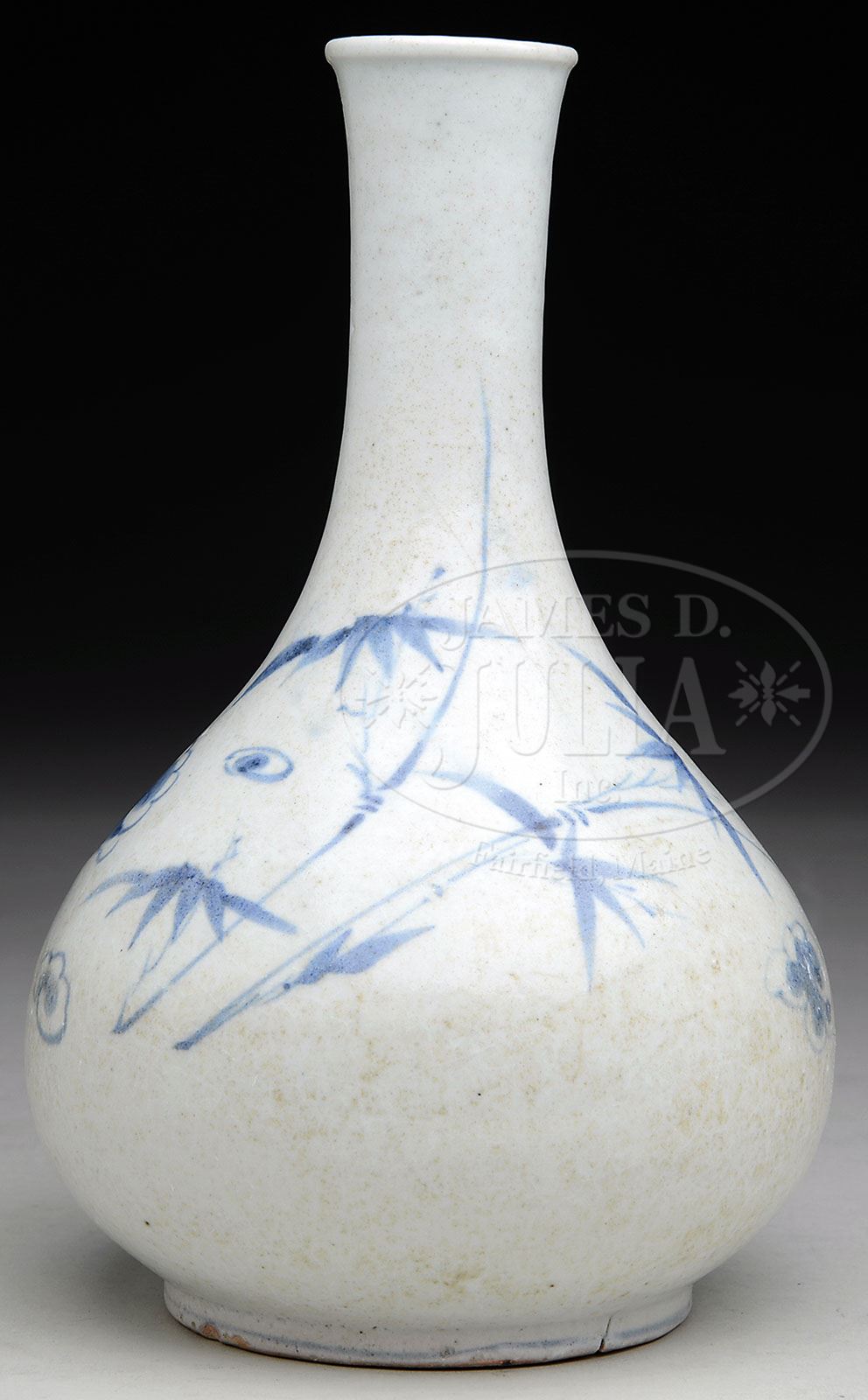 PORCELAIN WINE BOTTLE. Yi Dynasty, 18th/19th century, Korea. Wine bottle with underglaze blue decoration of a crane, clouds, and bamboo. SIZE: 8-3/4″ h. CONDITION: Hairline crack to the body, kiln crack to the foot. 7-74327 (500-700)