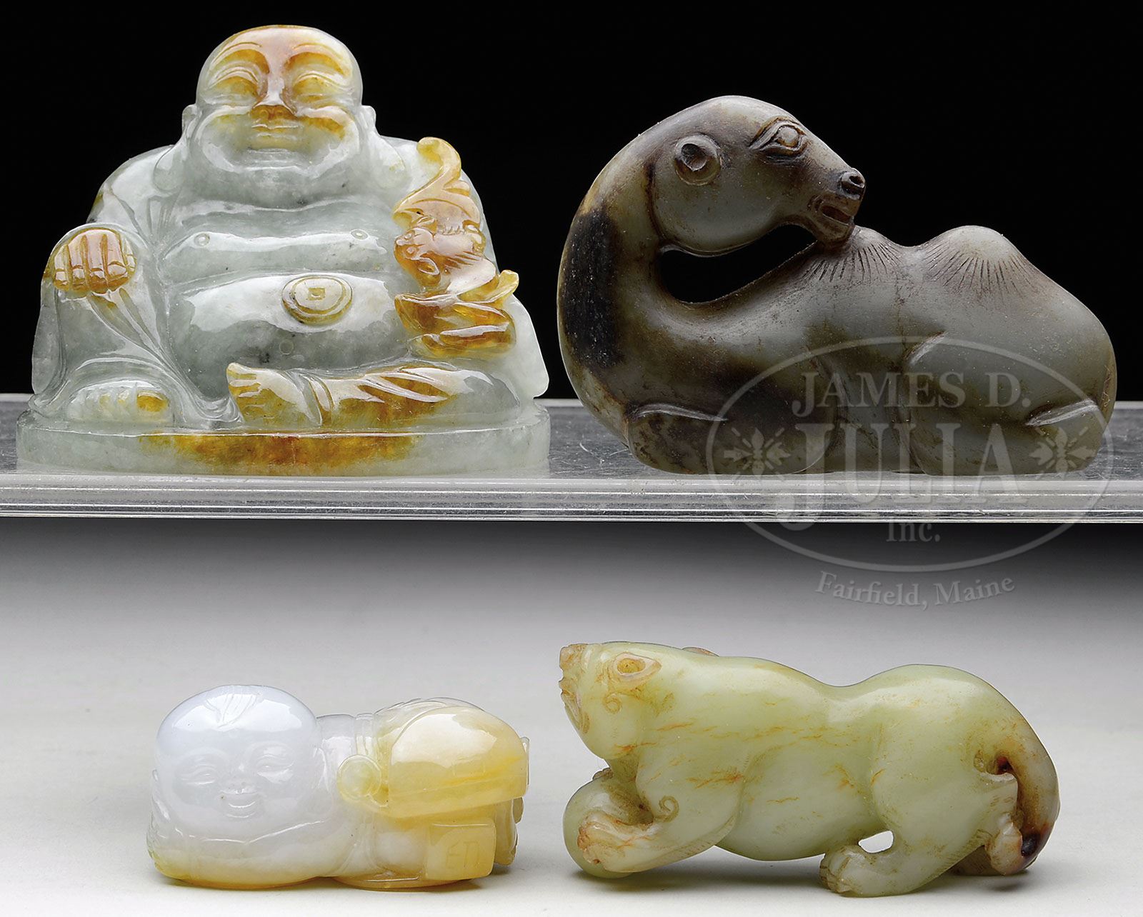 FOUR JADE CARVINGS. 20th century and earlier, China. Group consists of jadeite carvings of a figure of Mi Lo Fu and a child with cash coins, and 2 nephrite carvings of a camel and a feline with a ball. SIZE: Largest 3″ t, smallest 2″ t. CONDITION: Very good. 7-74186 (200-300)