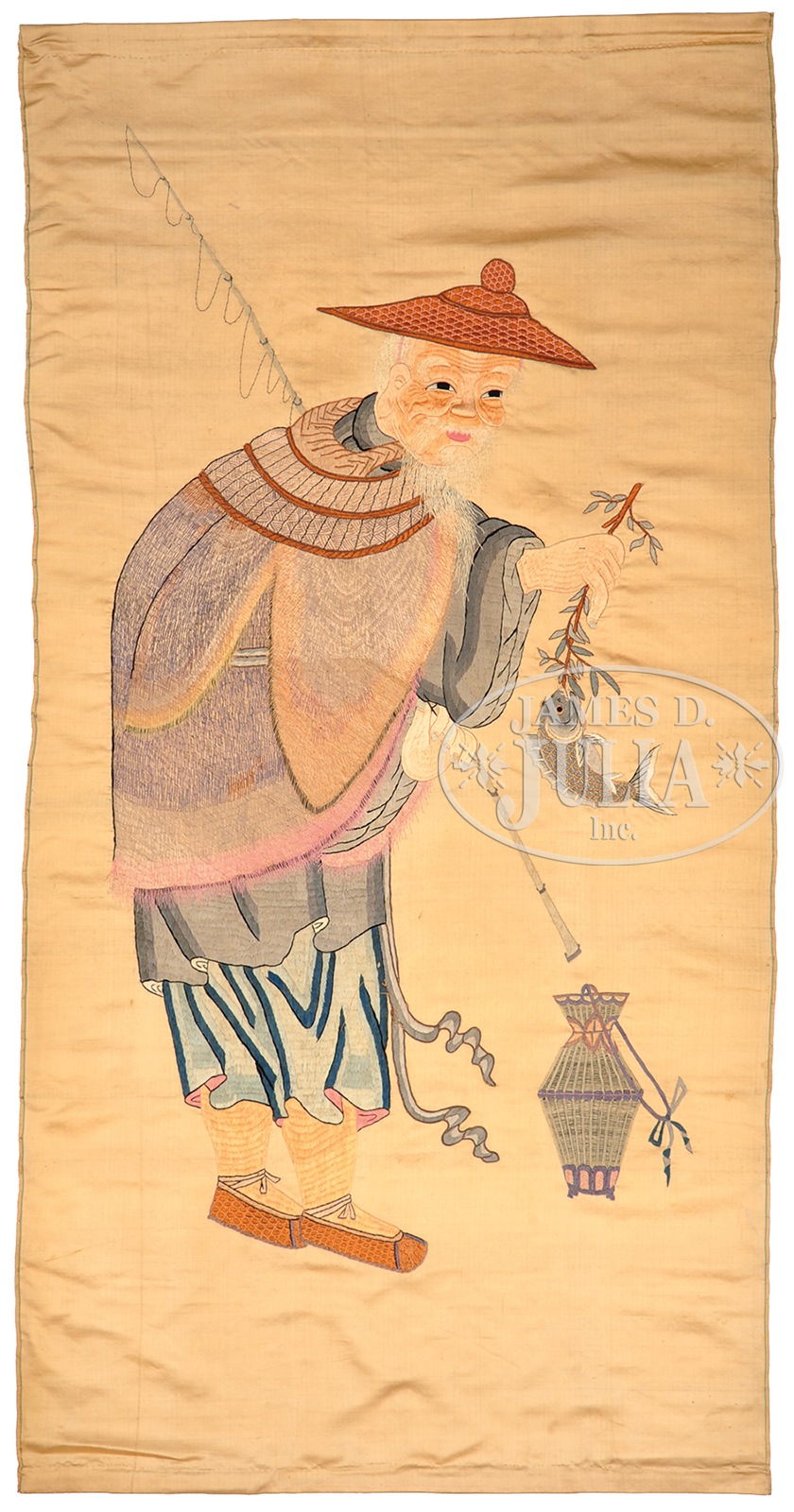 EMBROIDERED PANEL.19th to early 20th century, China. Scene of a fisherman. SIZE: 52″ t x 29″ w. CONDITION: Faded. 7-70688 (600-800) – Lot 4635