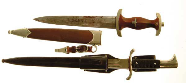 LOT OF 2 WWII GERMAN DAGGERS. 1) SA Corps dress dagger with 8-3/4″ dbl. edged blade by Bontgin & Sabin marked “ALLES FUR DEUTCHLAND” with brown hourglass shaped handle that has Nazi eagle and SA, in its original brown painted metal sheath with leather hanger. CONDITION: Good to very good. Blade is slightly dirty and stained, may clean. Handle is fine with one small chip. Sheath with 85% brown paint, one small dent. Hanger is fine. 2) Fireman’s dress bayonet, nickeled 9-3/4 single edged blade by Eickhorn, black handle scales with eagle head pommel and “S” shaped handguard. Black metal sheath with black frog. CONDITION: Excellent to new. 4-47108 JR328 (300-500)