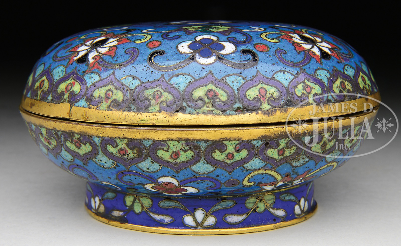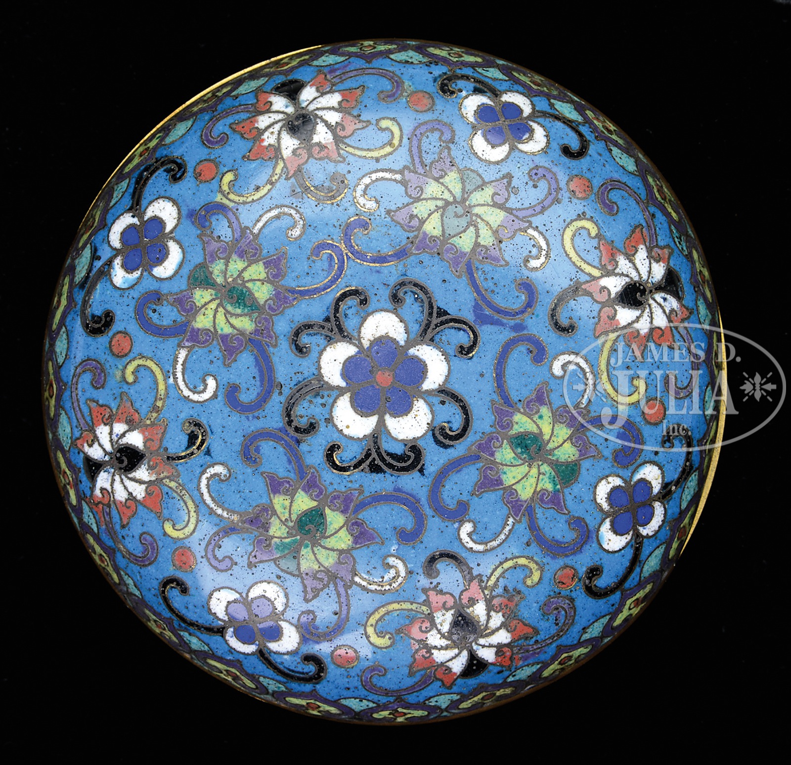 ROUND CLOISSONE BOX.19th century, China. Decoration of stylized floral scrolling on a dark turquoise ground. Ju-i borders. SIZE: 4″ dia. CONDITION: Loss to the enamel on the inside lid. 48106-1 (200-300) – Lot 4642