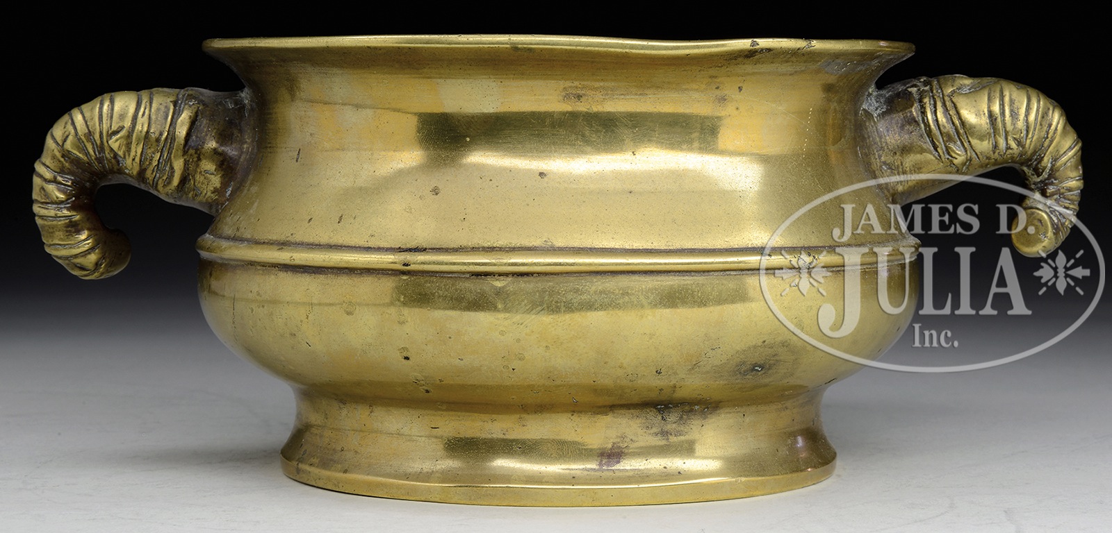 BRONZE INCENSE CENSER.China. 4-character mark to base. Elephant trunk handles. SIZE: 9-1/4″ handle to handle. CONDITION: Interior worn. Otherwise good. 1063-7 (200-300) – Lot 4663