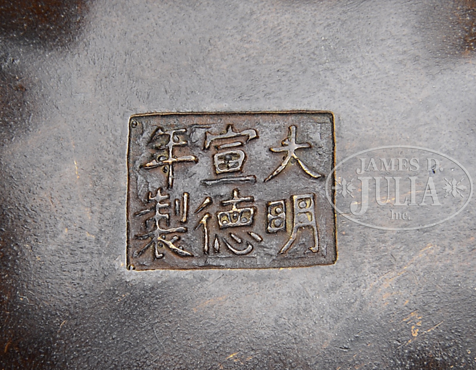 BRONZE CENSER.20th century, China. Lobated body with “heaven soaring” Handles. Hsuan Te mark on the base. SIZE: 2-1/4″ h x 5-1/2″ d. CONDITION: Shows some wear, very good. 1005-11 (200-300) – Lot 4666