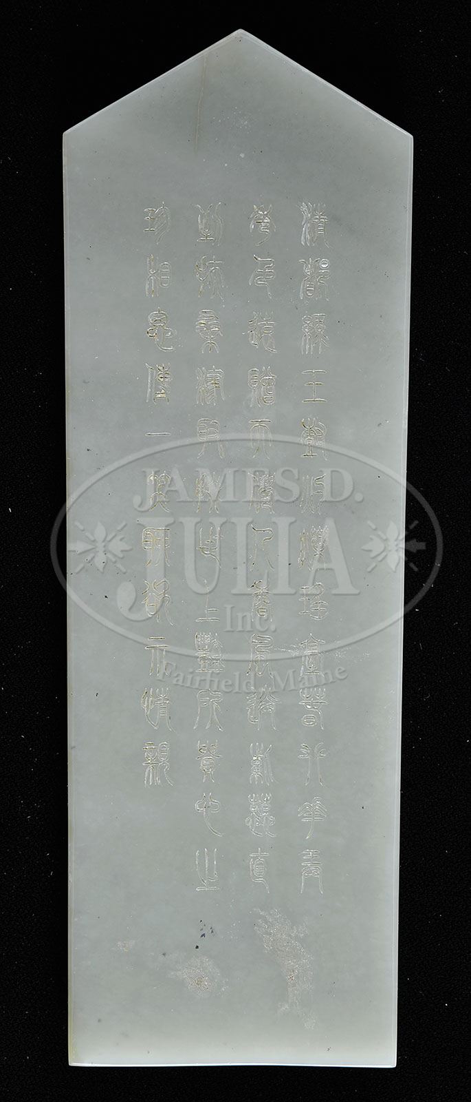 JADE PLAQUE. 20th century, China. A jade kuei tablet carved with mountains and archaic inscriptions. SIZE: 7-1/2″ l. CONDITION: Tight vertical hairline at peak, otherwise very good. 9-91059 (400-600)