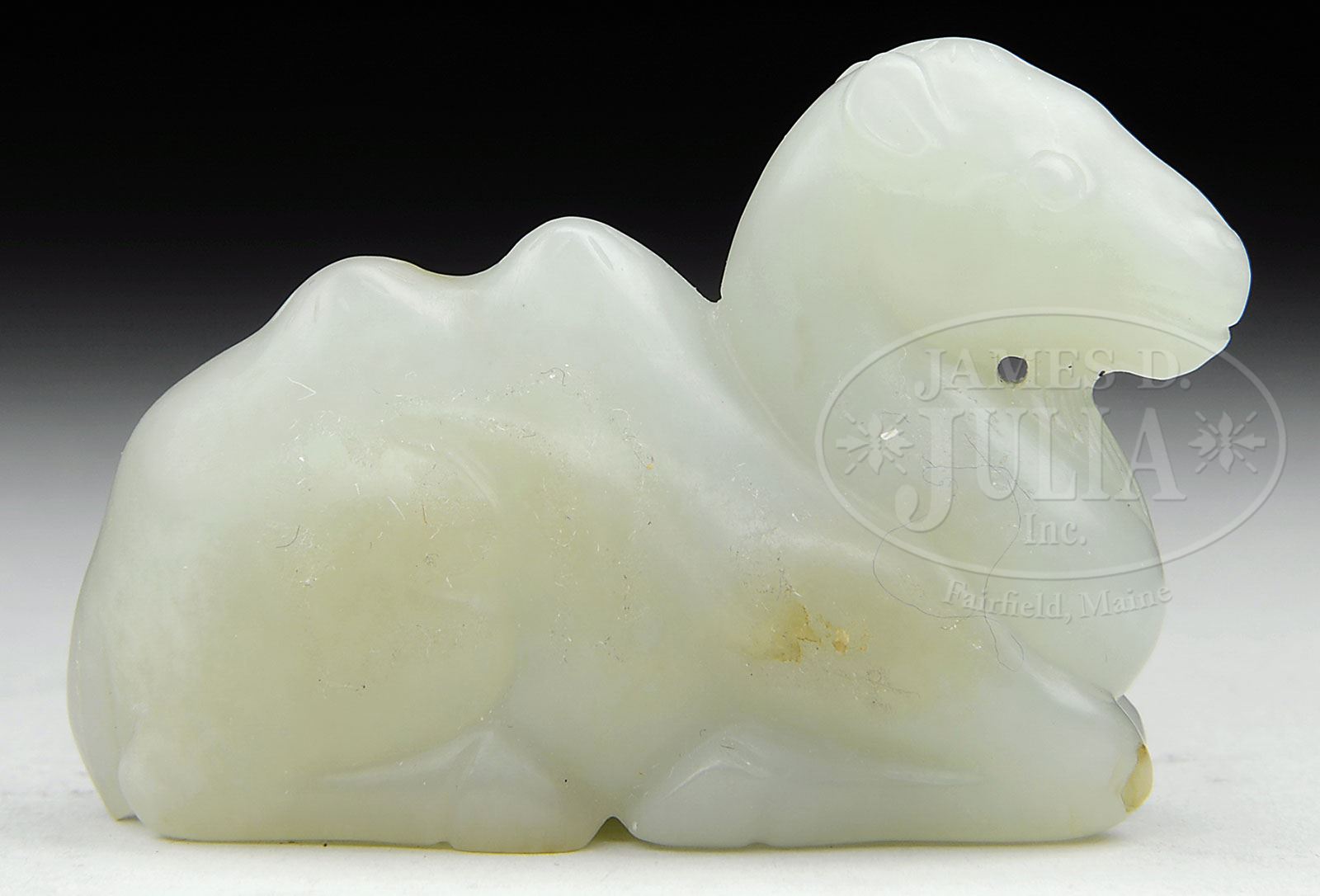 JADE CARVING OF A CAMEL. 20th century, China. White stone with a russet fissure. SIZE: 2-3/4″ l x 1-3/4″ t. CONDITION: Very good. 7-70501 (400-600)