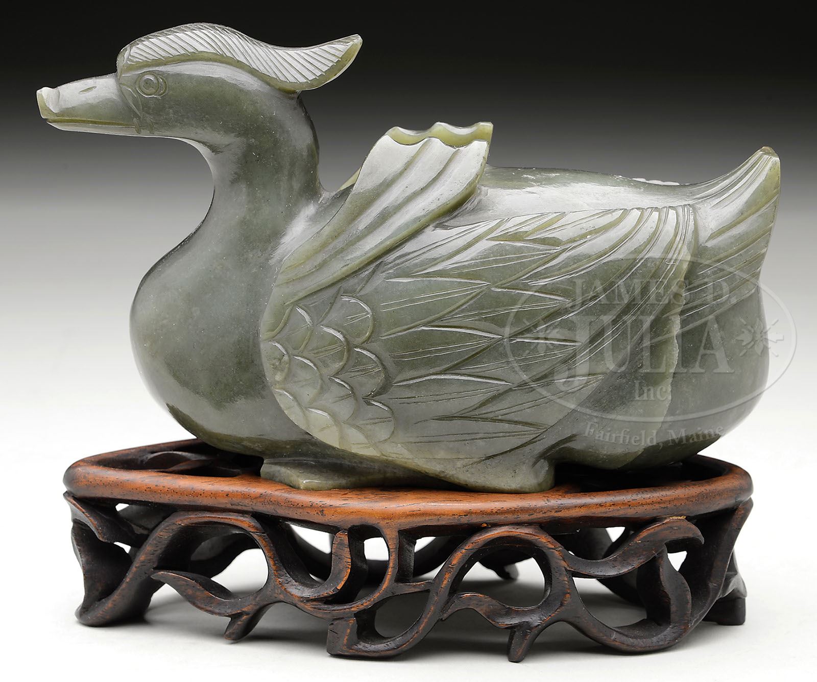 JADE DUCK ON STAND. 19th century, China. Forest green stone carved as a duck. On fitted hardwood stand. SIZE: 7-1/2″ l x 4-3/4″ t. CONDITION: Vertical natural fissure on proper left rear of carving. Otherwise very good. 9-91577 (300-500)