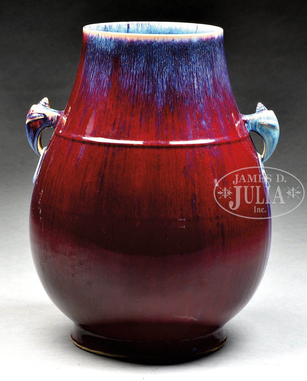 LARGE PORCELAIN VASE.Late 19th century China. Pear shaped with morphic faux jump handles. Single bowstring mark at the shoulder. Red Lang Yao glaze with streaks of blue. Indescribable seal mark on the base. SIZE: 16″ Dia, 20″ H CONDITION: Very good. 7-75176 (500-700) – Lot 4699