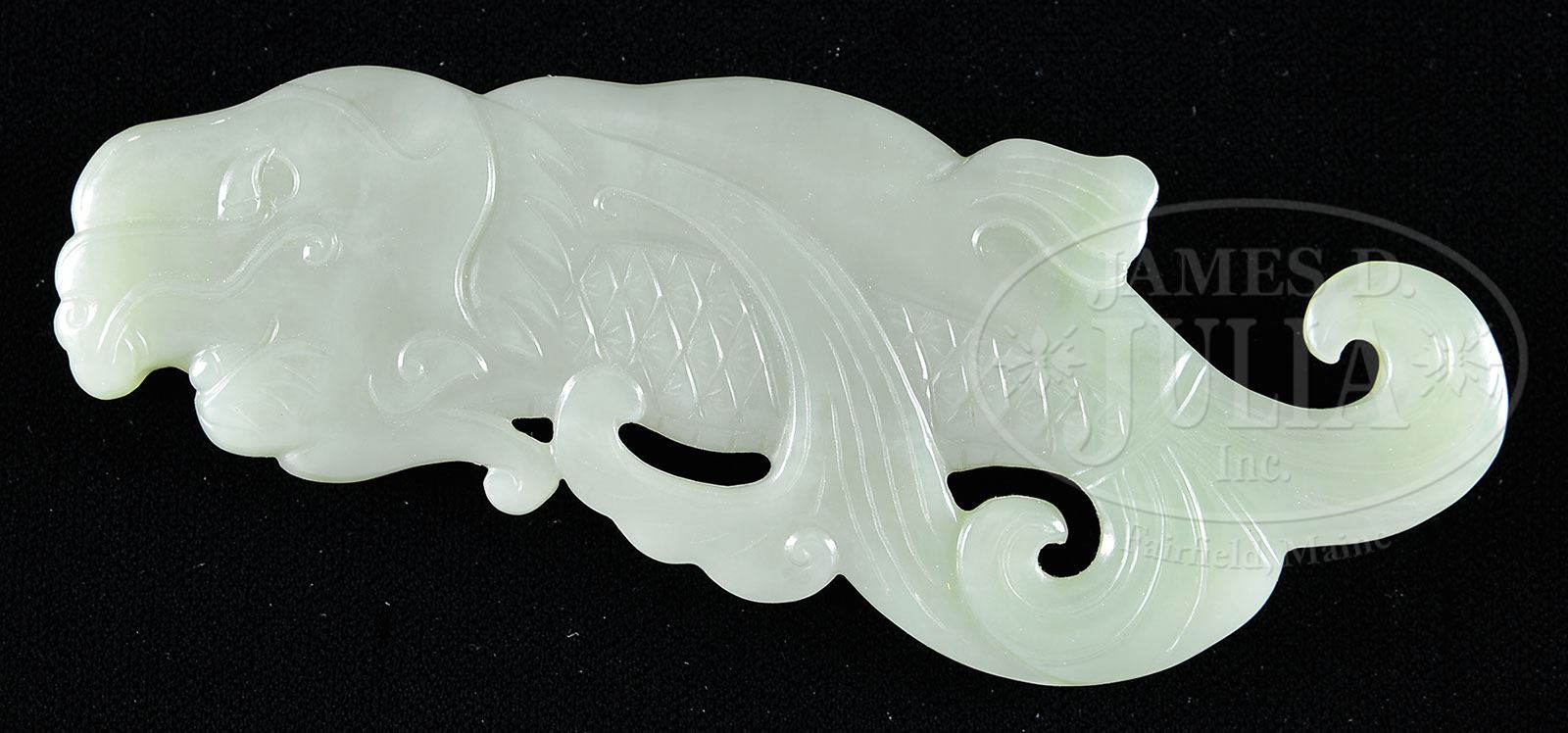 JADE CARVING. 19th century, China. Carving of a dragon carp in sea green color. SIZE: 4-3/4″ l. CONDITION: Very good. 9-90814 (250-350)
