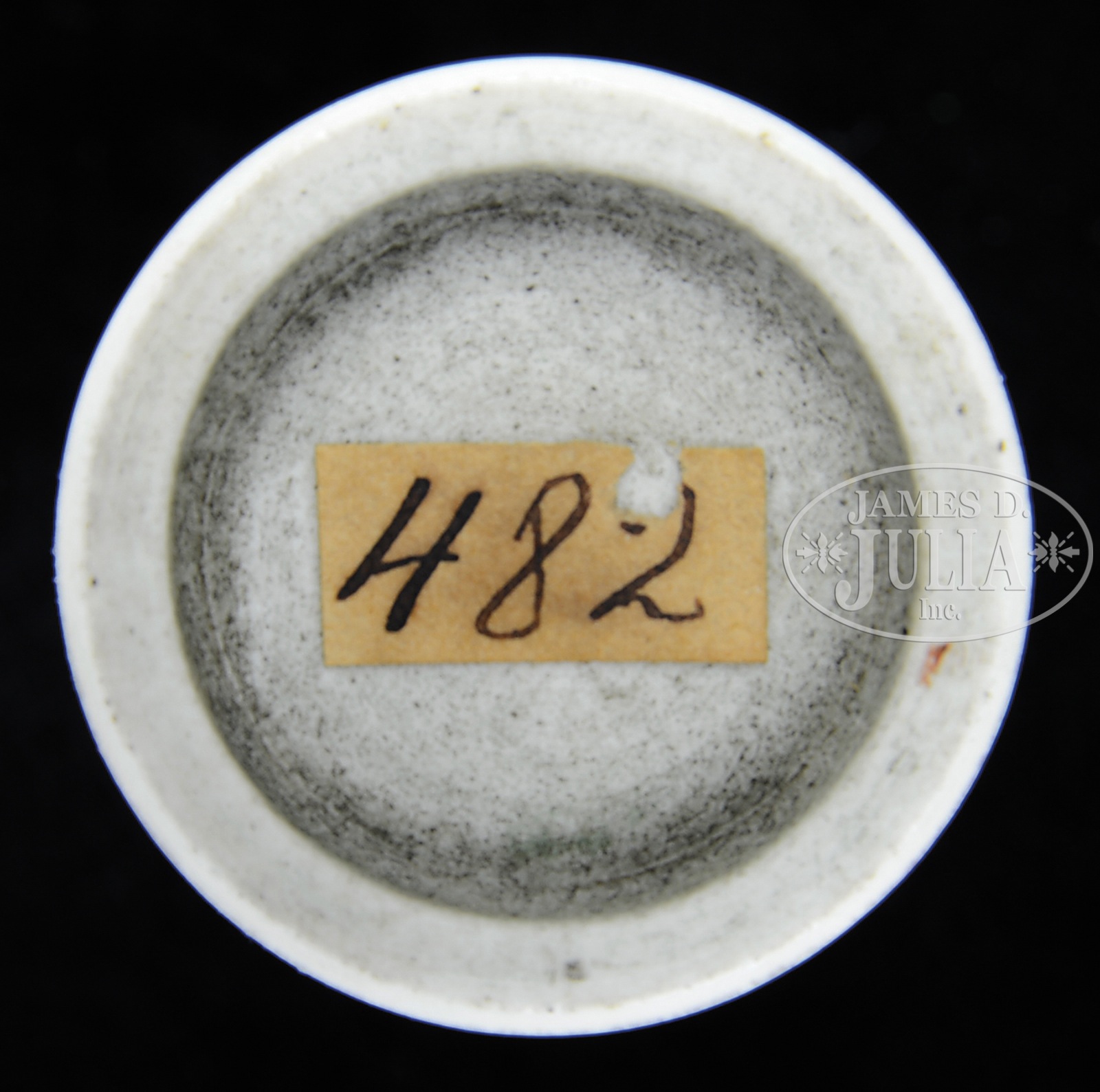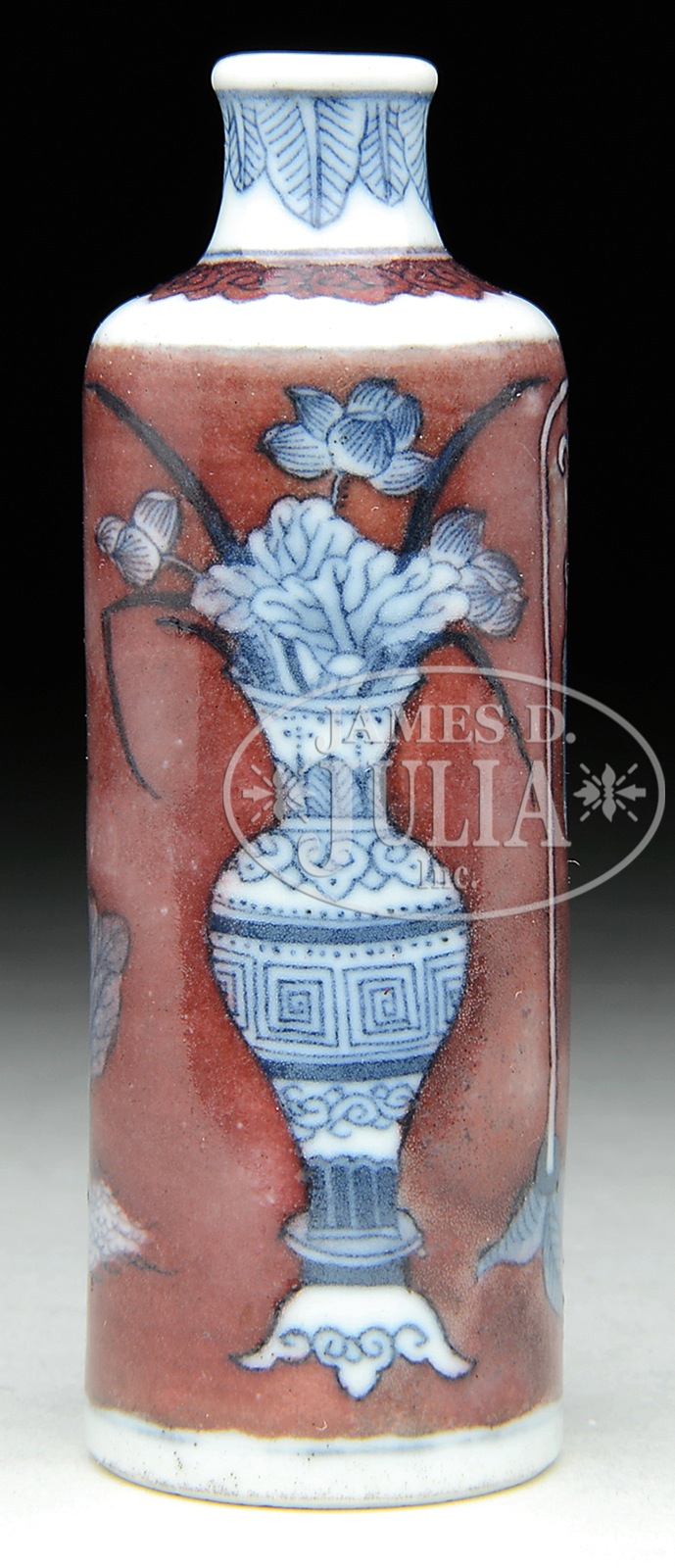PORCELAIN SNUFF BOTTLE.18th to 19th century, China. Cylindrical form. Underglaze blue and red decoration of the “Hundred Antiques” and vegetables. Old collector’s label on the bottom. SIZE: 3-1/4″ h. CONDITION: Very good. 48106-6 (200-300) – Lot 4716