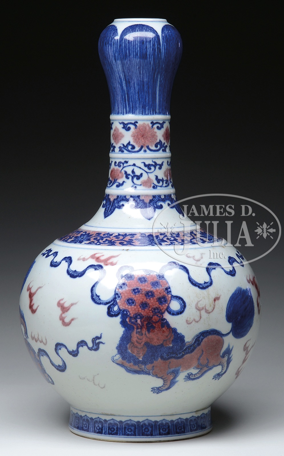 UNDERGLAZE BLUE AND RED PORCELAIN BOTTLE VASE.20th century, China. The vase in bottle form with rounded body tapering to a tall cylindrical neck ending at a garlic form top. The body painted in underglaze blue and red depicting foo lions playing with brocade balls. The neck decorated with bands of vines and flowers each separated by a raised ring done in relief. It stands on a slightly splayed foot painted with a ring of lappets with the underside being unglazed. SIZE: 15-1/2″ h x 9-1/2″ dia. CONDITION: Very good. 48876-3 (400-500) – Lot 4723