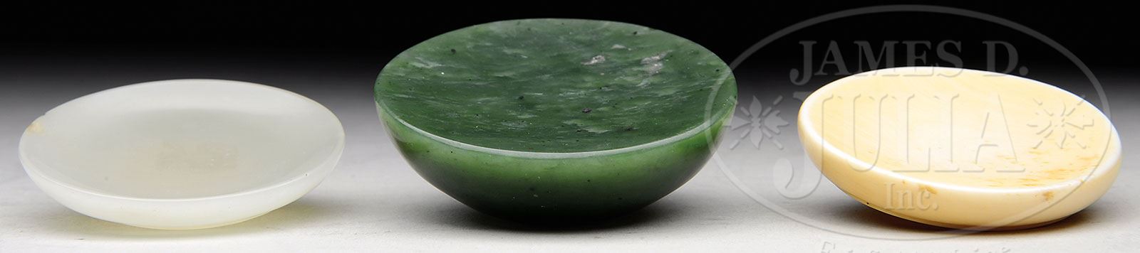 THREE SNUFF TRAYS. 19th century, China. Lot consists of a dark green jade, light green jade, and ivory tray. SIZE: Largest 2″ dia. CONDITION: Very good. 7-74219 (200-300)