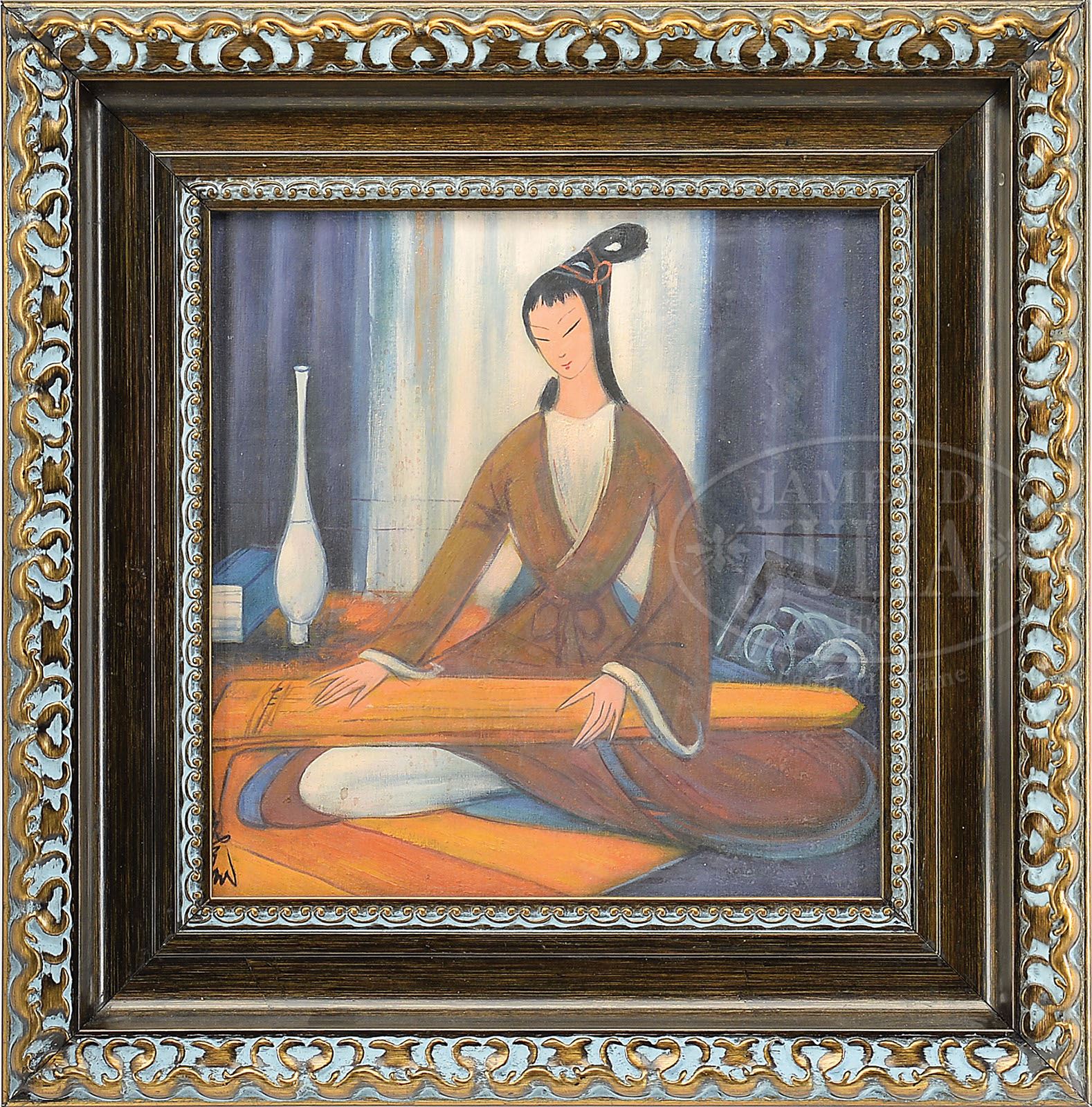 PAINTED PAINTING IN THE MANNER OF LIN FENGMIAN. China, oil on canvas, depicting an elegant lady playing a zither, signed to the lower left corner, framed and glazed SIZE: 15-1/4″ x 14-3/4″. CONDITION: Good. 9-91624 (400-600)