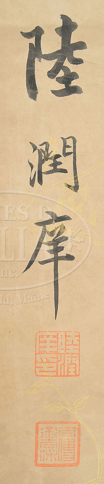 CALLIGRAPHY COUPLET IN THE MANNER OF LU RUNYANG. China, standard script on gilt yellow paper, dedicated to Mr. Ren Xiong, signed, with two seals. SIZE: 52″ x 12″. CONDITION: Good with minor creases. 9-90858 (400-600)
