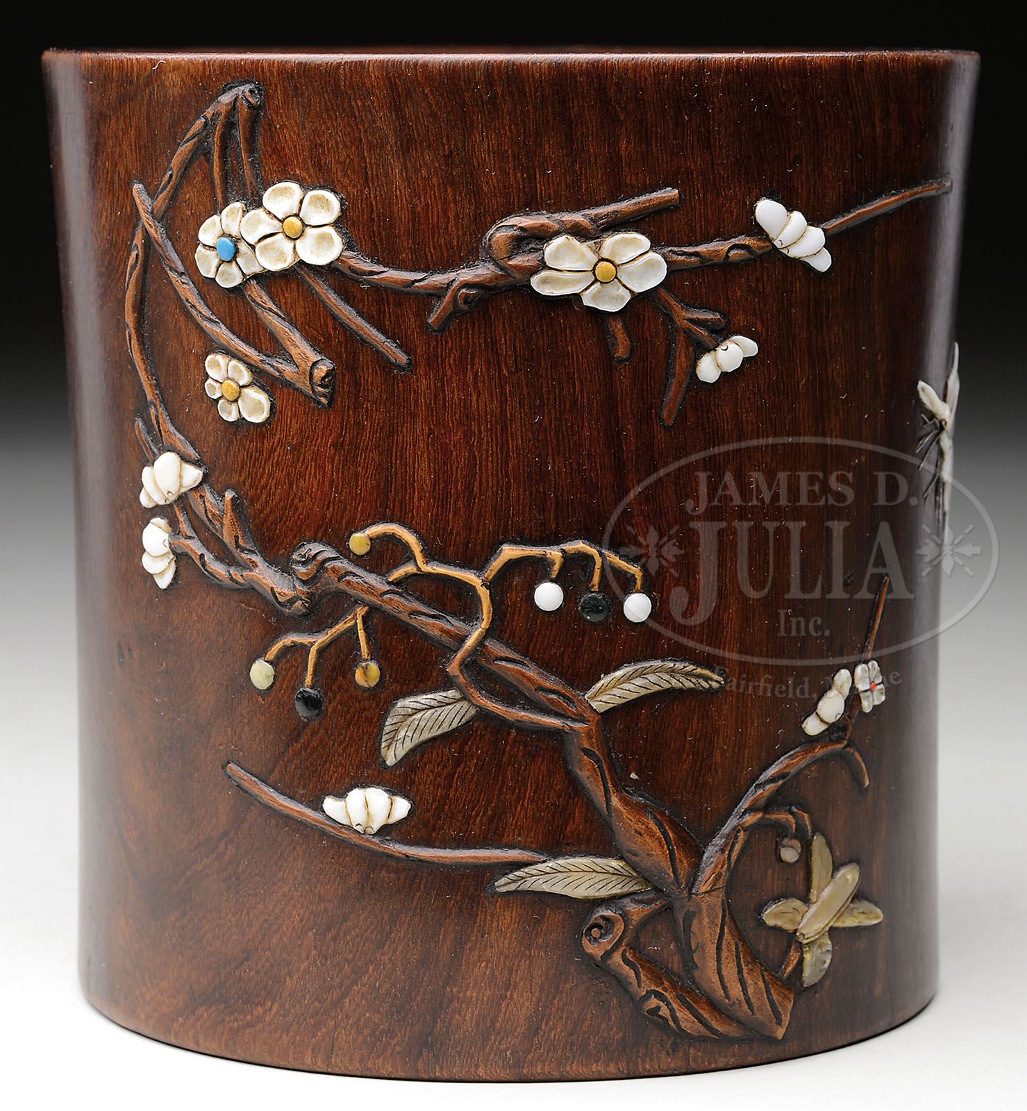 INLAID HARDWOOD BRUSH POT. 20th century, China. Surface inlaid with butterflies and a flowering tree in mother of pearl and soapstone. SIZE: 6″ t x 6″ dia. CONDITION: Missing plug in bottom, otherwise very good. 7-74224 (200-300)