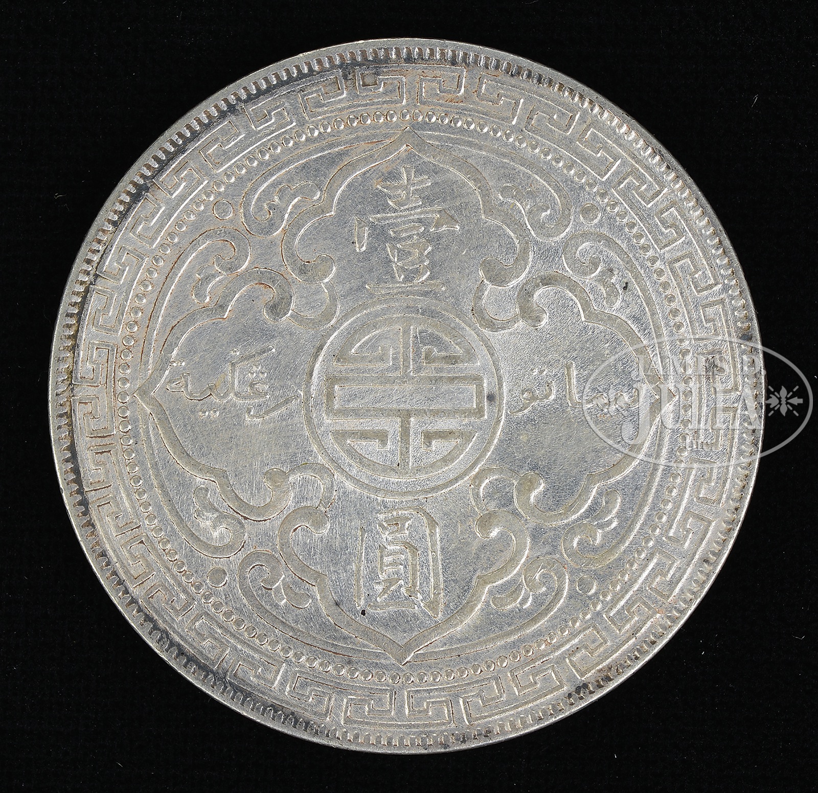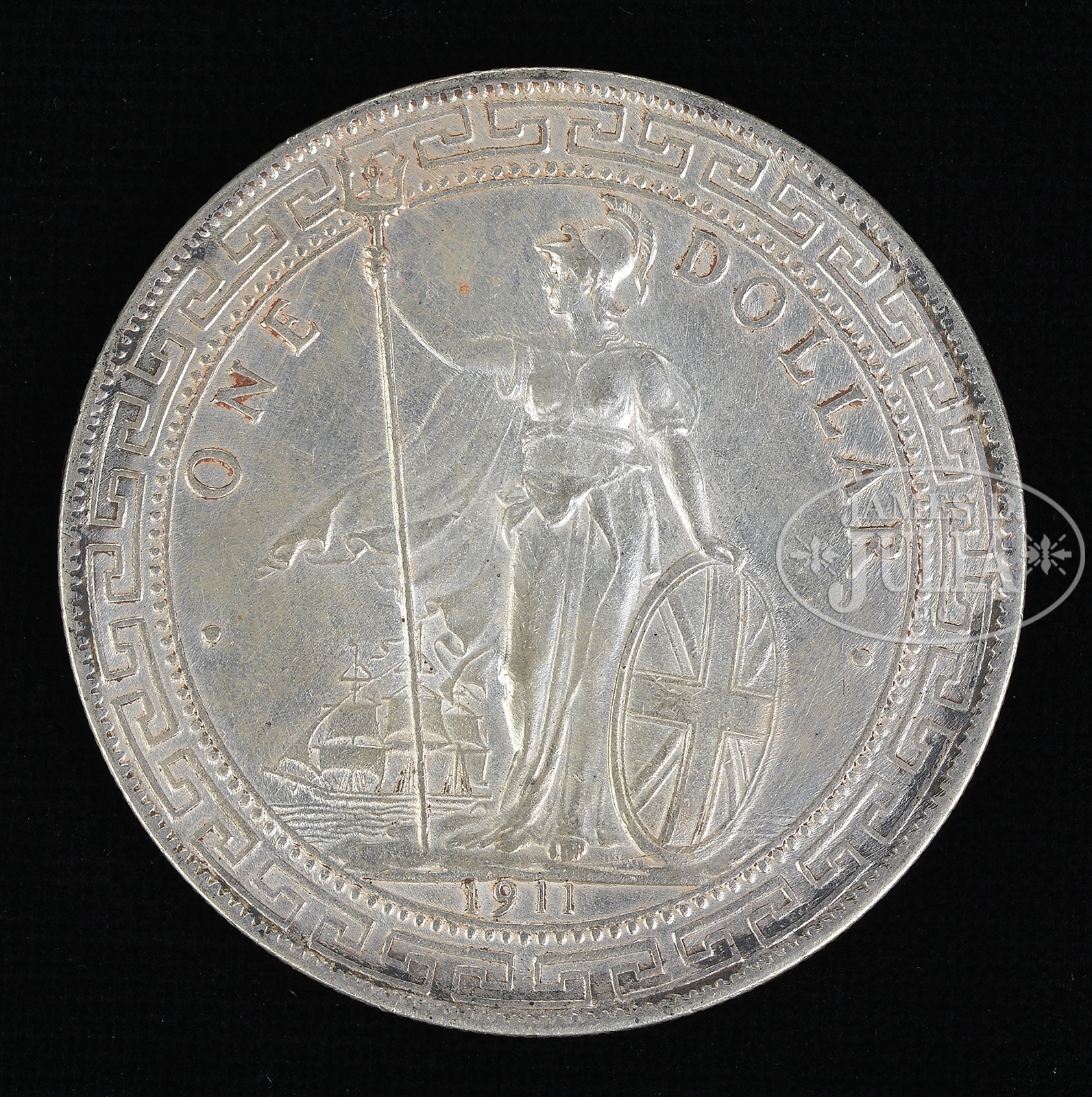 ONE DOLLAR HONG KONG COIN.Dated 1911. One side with the female personification of Great Britain, the other with a long stylized lotus and longevity character with Tibetan script. SIZE: 1-3/8″ dia. CONDITION: Edges slightly worn. 47964-68 (100-150) – Lot 4828