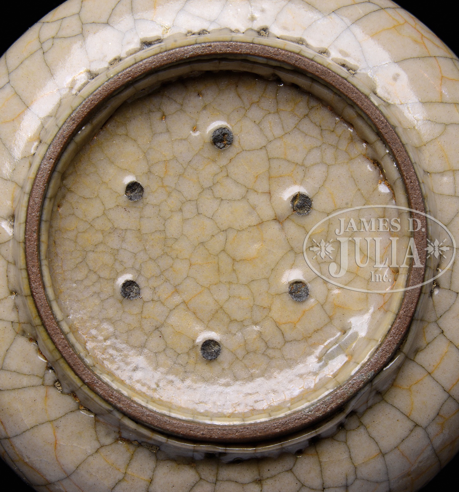 CRACKLE GLAZED PORCELAIN CENSER.20th century, China. The body with squat form and having a slightly flared top rim. Accented with two lug handles and the exterior finished with a crackle glaze having a cream color. Standing on a slightly inverted foot and showing six spur marks on the underside. SIZE: 2-1/2″ h x 4-1/2″ dia. CONDITION: Very good. 1070-9 (200-300) – Lot 4852