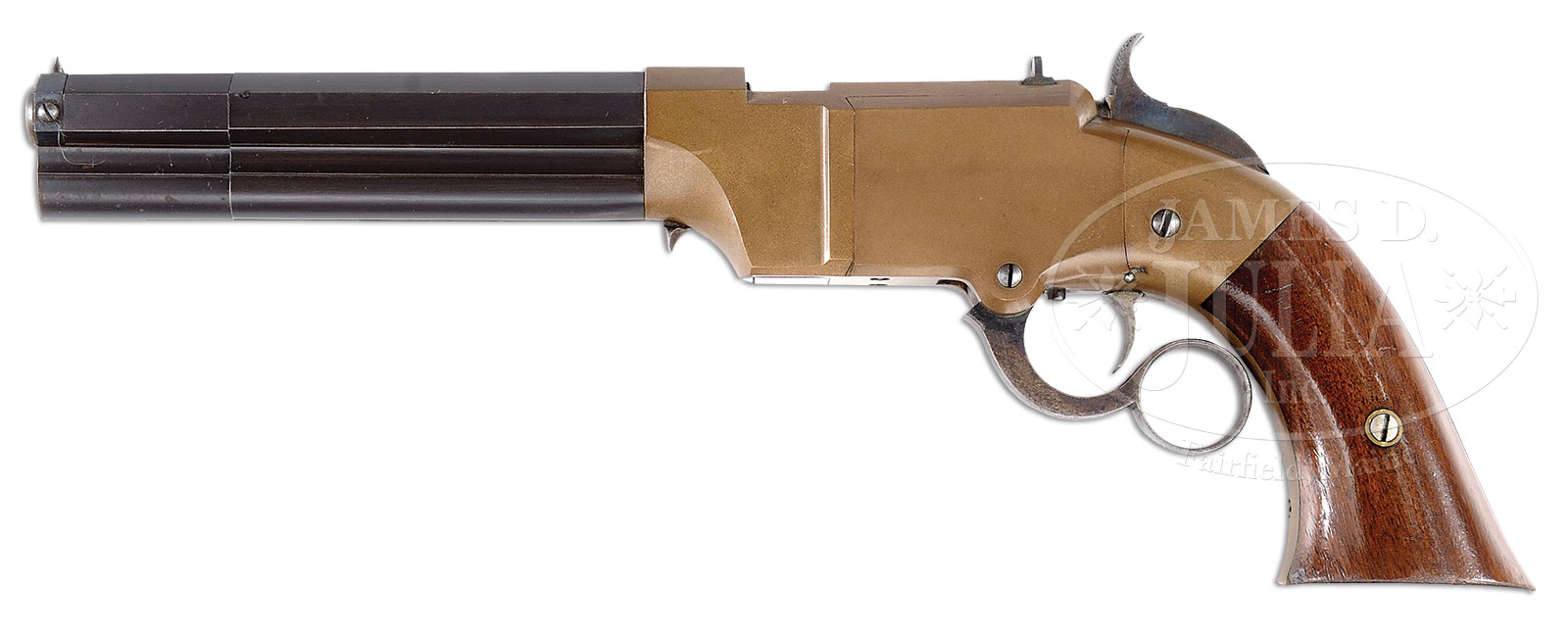 SUPERB AND RARE VOLCANIC REPEATING ARMS COMPANY LEVER ACTION NAVY PISTOL WITH 6″ BARREL.SN 662. Cal. 41. 6″ bbl. Blue finish with gun metal receiver, case color hammer, blue lever. Bbl shows 3-line address that reads “The Volcanic Repeating Arms Co. Patent New Haven Conn Feb. 14. 1854”. Rear face of loading collar shows assembly no. “47”. Front face of bbl also shows assembly no. “47”. SN is stamped on left inside of grip frame, on inside of sideplates, on side of each toggle, on left side of elevator, left side of firing pin, and at top inside of each grip. CONDITION: Excellent. Bbl shows almost all orig blue, very slight fading near address. Front face of collar near “T”-latch shows some light aging as does muzzle of bbl. Bore is slightly pitted toward muzzle with some evidence of being fired. Bbl shows some light high point wear with a sharp mark. Receiver is a deep rich mustard-brown patina and minuscule handling marks. Right sideplate is very slightly battered at top edge. Ejector port shows a few small dents. Hammer face is slightly battered. Rear-sight retains most all fire-blue. Elevator has traces of fire-blue around bolt. Bottom of elevator also shows generous traces of fire-blue finish. Hammer retains nearly all the case color on left side. Right side is somewhat dull and lightly scratched. Checkering is sharp. Hammer screw is slightly marred. Lever retains half of its bright blue finish with balance turning a smooth silver-gray patina. Trigger shows traces of case color. Trigger spring retains nearly all of fire-blue finish. Grips retain nearly all of piano varnish finish with only some slight scratch marks and a little high point wear on bottom of each grip. An opportunity for the advanced collector to obtain an outstanding example of an extremely rare Volcanic Repeating Arms Company Navy size lever action pistol in a condition that would be difficult to improve upon. 51096-4 (30,000-50,000) – Lot 1002