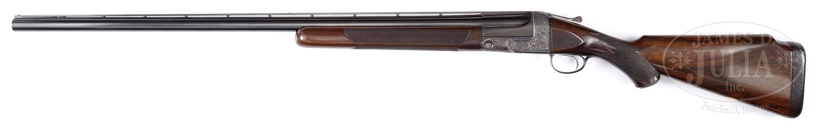 *EXCELLENT PARKER SC GRADE SINGLE BARREL TRAP SHOTGUN. SN 179320. Cal. 12 ga. 32″ fluid steel bbl. 2-3/4″ chamber. Choke full. Full length low profile ventilated matted top rib with twin ivory beads. Checkered nickel plated trigger, ejector, no safety. Capped full pistol grip Monte Carlo buttstock, checkered in 3-point pattern with checkered cheeks and 14-1/4″ LOP over black leather covered pad. Large trap forearm with Deeley release, checkered in 3-panel pattern. Receiver is nicely scroll and punch-dot engraved in typical SC pattern and marked “Parker Bros.” on sides. All visible SN’s match. Bore diameter: .733. Bore restrictions: .028 (IMod). Wall thickness: .065. Drop at heel: 2-1/8″ at rear of Monte Carlo 1-5/8″ in front, drop at comb: 1-1/2″. WEIGHT: 7 lbs, 11 ozs. CONDITION: Fine. Bbl retains 95-97% orig blued finish, receiver with 60-70% nice orig case color. Buttstock has been expertly restored and shows evidence of a now near invisible repair at wrist and minor losses at top tang. Forearm is excellent and retains most of what appears to be its orig finish with a couple of very minor age separations at frame. Trigger guard retains approximately 50% orig blued finish, trigger checkering is contemporary. Bore is bright and shiny. Mechanics are fine. A very nice early