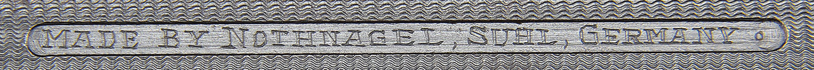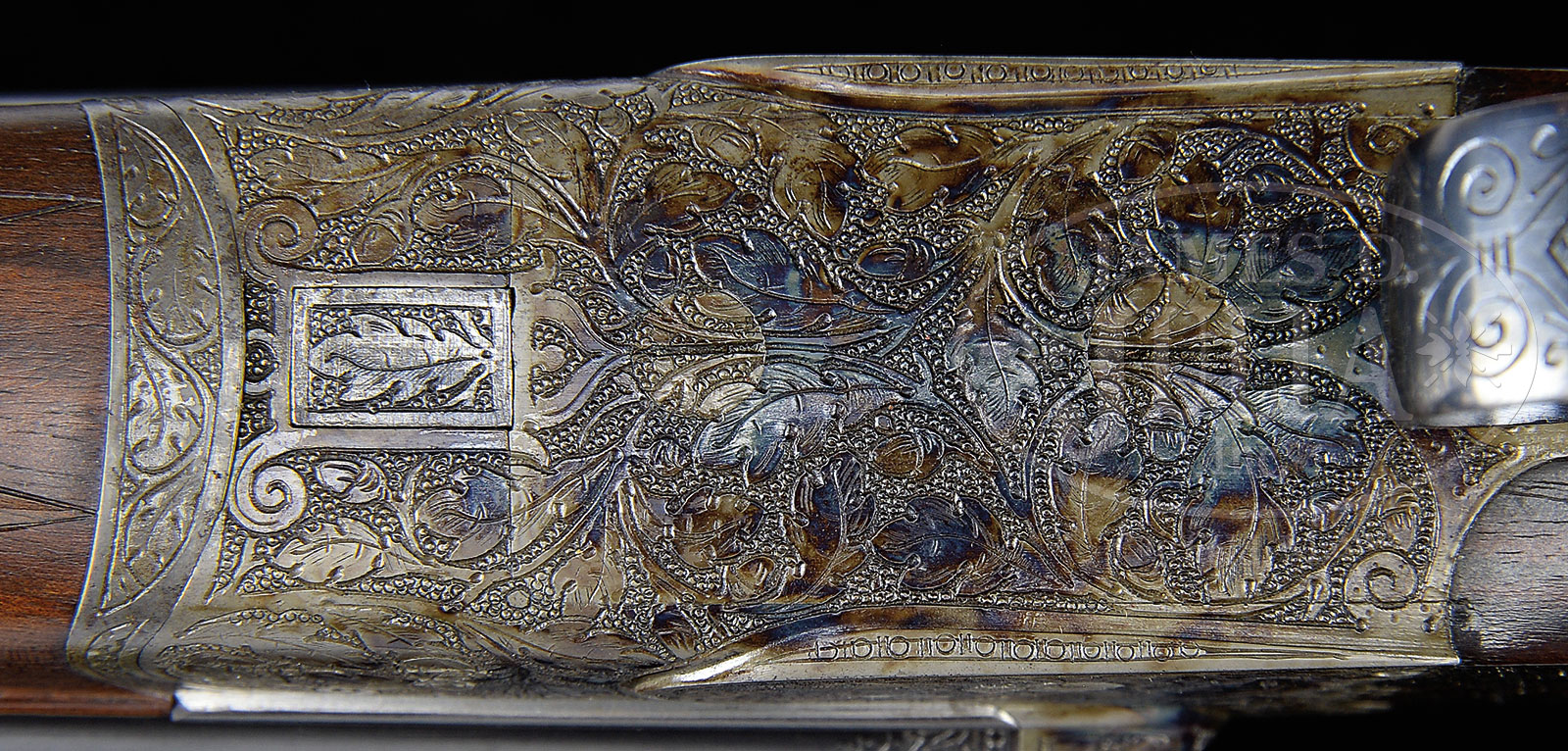 *RARE WAR PRODUCTION BOXLOCK DOUBLE SHOTGUN BY NOTHNAGEL.SN 263. Cal. 16 ga. 2-1/2″ Chambers. 29-1/2″ Shoe lump bbls with concave matted rib are marked “Made by Nothnagel, Suhl, Germany” in milled out portion of rib. Bbl flats are stamped with Feb 1945 Nazi era proofs. Sling loop is screwed to bottom rib. Case hardened scallop backed boxlock action features non-automatic safety, pin type cocking indicators, crossbolt third fastener, side clips, and dbl triggers. Action is engraved with near full coverage scrolling oak leaves and acorns in dot shaded background surrounding game scenes on sides; trio of hares on left, and fox vexing a pair of ducks on right. Steel trigger guard is engraved with more oak leaves and acorns. Lightly figured European walnut capped pistol grip buttstock measures 14-1/8″ over ribbed composition buttplate, and features shadow line right hand cheekpiece, and well cut point pattern checkering at grip. Matching splinter forend has Deeley release. Bore diameter: left -.661, right – .663. Bore restrictions: left – .025 (IMod), right – .021 (mod). Wall thickness: left – .033, right – .040. Drop at heel: 2-13/16″, drop at comb: 1-7/16″. Cast slightly off. Weight: 6 lbs. 11 oz. LOP: 14-1/8″. CONDITION: Excellent, very close to new with only some high edge wear on metal finishes, and a touch of silvering on top tang, and thinning of blue on trigger guard tang. Stocks have only a few minor nicks in their orig finish. Bores are excellent. Action is tight. An interesting gun, most likely made for American GI’s right after the war (English nomenclature) before Soviet occupation of Eastern Germany. 51872-1 MGM (2,500-3,000) C&R – Lot 1701