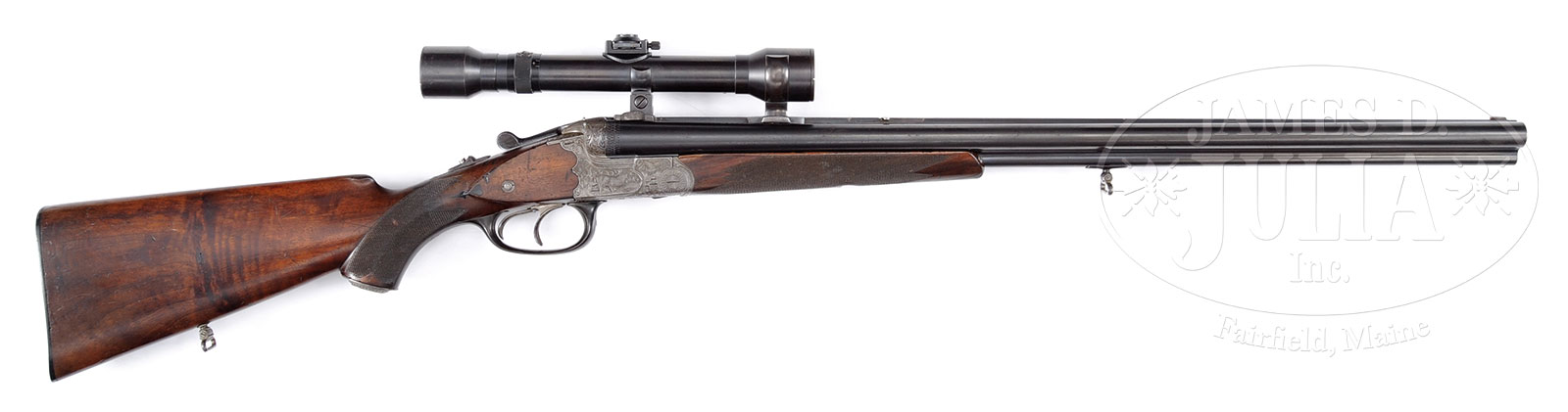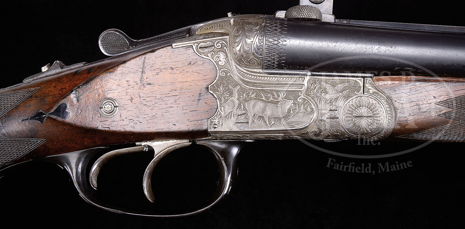 *VERY UNUSUAL DOUBLE RIFLE DRILLING BY FRANZ KETTNER, WITH EXTRA STANDARD DRILLING BARRELS WITH SCOPE AND MODERN CASE.SN 2963. Cal. 16 x 16 x 9x57R, 16 x 8x57R x 8x57R. Double rifle bbls in unusual right bbl shotgun/ left bbl rifle over rifle configuration, are 23-5/8″ long and standard drilling bbls are 25-5/8″ long. Both have full length matted ribs and are fitted with scope bases. “FRANZ KETTNER” and “KOLN – SUHL” are engraved on tops. Double rifle bbl set has one standing, one folding leaf U-notch rear sight. Standard bbls have typical pop-up sight. Bbl flats of standard bbls are stamped with imperial German proofs with proof date of January 1931. Double rifle bbls are stamped with Nazi era proofs for 8 x 57 with a date of February 1941. Sling loops are soldered to bottom bbls. Coin finished scallop backed boxlock action with rifle/ shotgun selector on top tang, has Greener type side safety. Action features pin type cocking indicators, crossbolt third fastener, bushed strikers, double triggers (front set), and Kettner’s reverse side clip system with ears on rear portions of bbls engaging recesses in fences. Action is engraved in full coverage Germanic open scrolling acanthus with stippled background surrounding vignettes of game on sides; roebuck and doe, as well as a pheasant on left, with bugling stag and hind as well as a duck on right. Trigger guard is of horn. Well figured European walnut steel capped pistol grip buttstock measures 14″ over horn basket weave buttplate, and features shadow line right hand cheekpiece, inlet fancy horn drop points, point pattern checkering, and a sling loop matching that on bbls, on toe line. Matching small forend with inset schnabeled horn tip has Deeley release and services both bbl sets. Hensoldt 4X scope with single post reticle is fitted to orig drilling bbls. Regular Drilling Bbls: Bore diameter: left -.672, right – .671. Bore restrictions: left – .028 (Imod), right – .027 (IMod). Wall thickness: left – .027, right – .030. Drop at heel: 2-5/8″, drop at comb: 1-11.16″. Neutral cast. Weight without scope: 7 lbs.2 oz. LOP: 14″. DBL Rifle BBLS: Bore diameter: right – .663. Bore restrictions: right – .034 (full). Wall thickness: right – .030. Drop at heel: approx 2-1/2″, drop at comb: approx 1-7/8″. Weight: 7 lbs. 12 oz. LOP: 14″. Gun is housed in a relatively new Americase with black interior. CONDITION: Fine. Bbls retain most of what appears to be their orig blue with numerous light marks and some cleaned flecking. Action retains most of its french grey finish considerably darkened. Stocks retain most of their orig oil finish with numerous light marks and scratches overall, checkering worn. Bores are excellent. Action is tight. Set trigger won’t set (most likely needs adjustment). Scope re-blued, optically fine. Case is close to new. 51872-28 MGM (7,500-10,000) C&R – Lot 1722