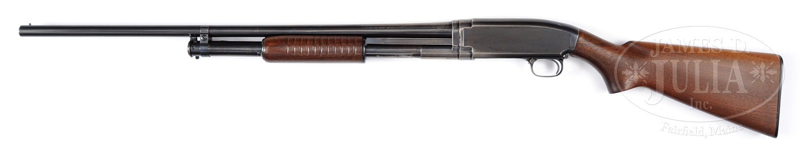 *WINCHESTER MODEL 12, 20 GAUGE SHOTGUN.SN 1143123. Cal. 20 ga. 26″ Bbl with steel front bead. 2-3/4″ chambers. Choke marked full. 13″ LOP over Winchester hard rubber buttplate. Lined forearm. All visible SN’s match. WEIGHT: 6 lbs, 1 ozs. CONDITION: Good. Retains approximately 65% orig blue finish to bbl and receiver. Buttstock and forearm are good having been refinished long ago, slightly undersized with scattered light handling marks. Bore is bright and shiny. Mechanics are fine. 51873-11 JSL (300-400) C&R – Lot 2562