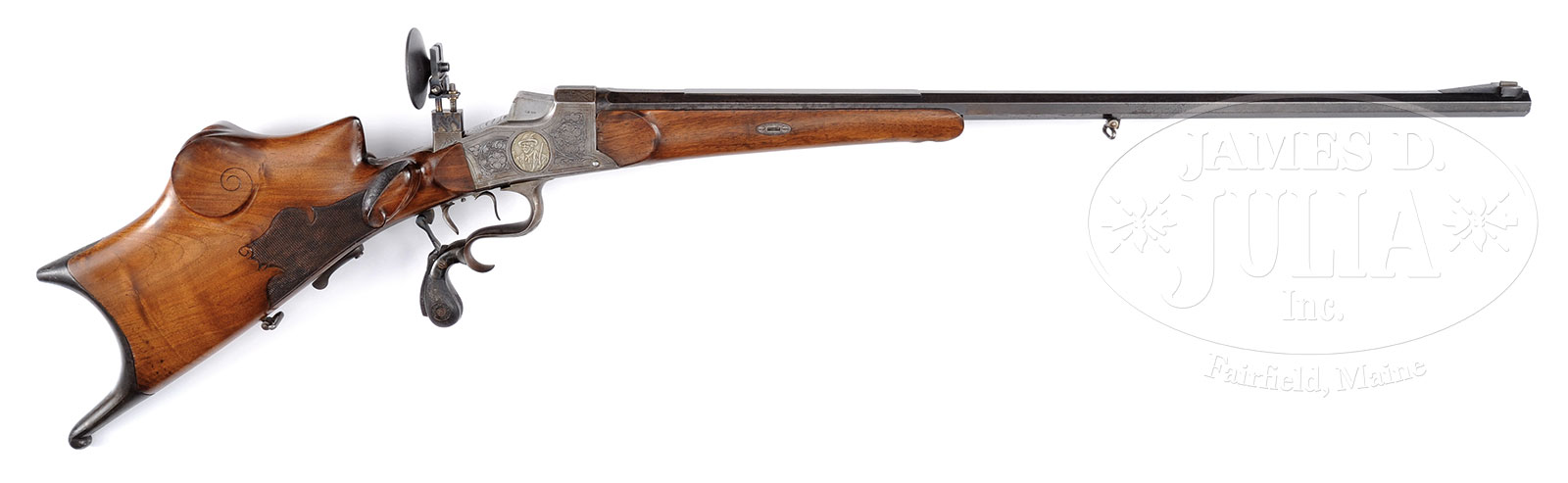 *C. G. HAENEL BUCHEL PATENT SCHUETZEN RIFLE WITH WELL DETAILED RELIEF DECORATION.SN 1792 (on bottom of bbl with forend removed). (1924) Cal. 8.15 x 46R. 31″ Octagon bbl, patent dropping block single shot action with removable trigger assembly and hard rubber bulbous grip on operating lever, has two inset silver panels on sides of action relief embellished with buxom maiden holding a target on left, and old Jaeger on right. European walnut buttstock with hook butt and high sculpted cheekpiece, is nicely checkered. CONDITION: Good. Metal mostly gray to brown patina with traces of orig case color on action. Stocks refinished over some marks. Rear sight is a newly made replacement using a large old disc. Bore is good to fine. 51873-18 MGM (2,000-3,000) C&R – Lot 2664