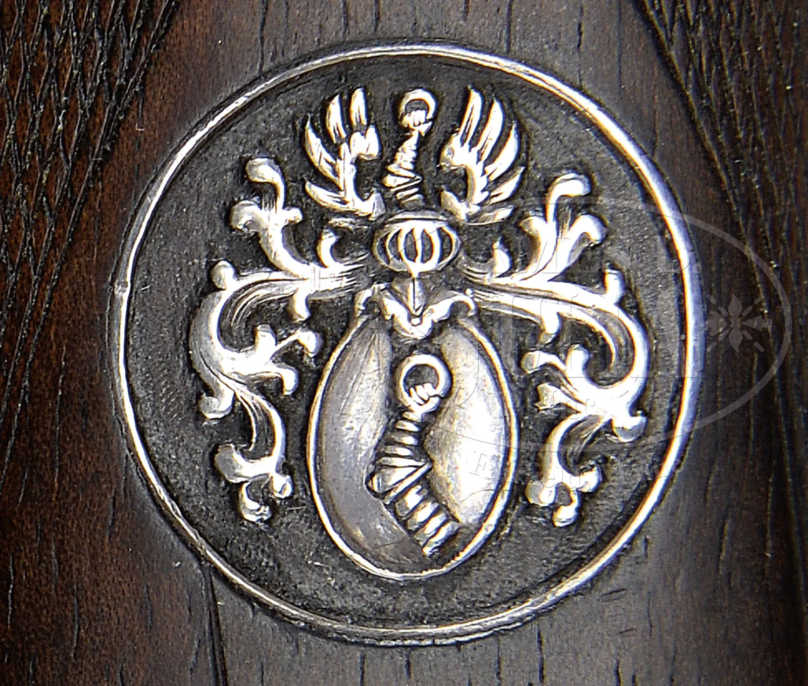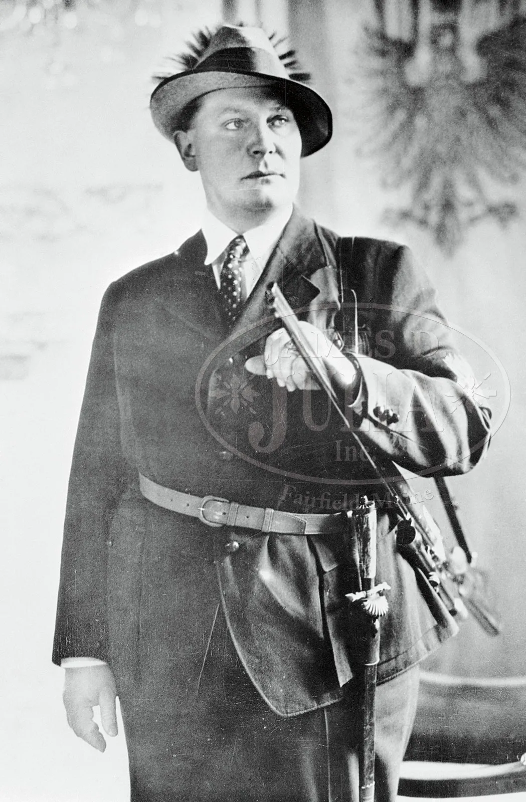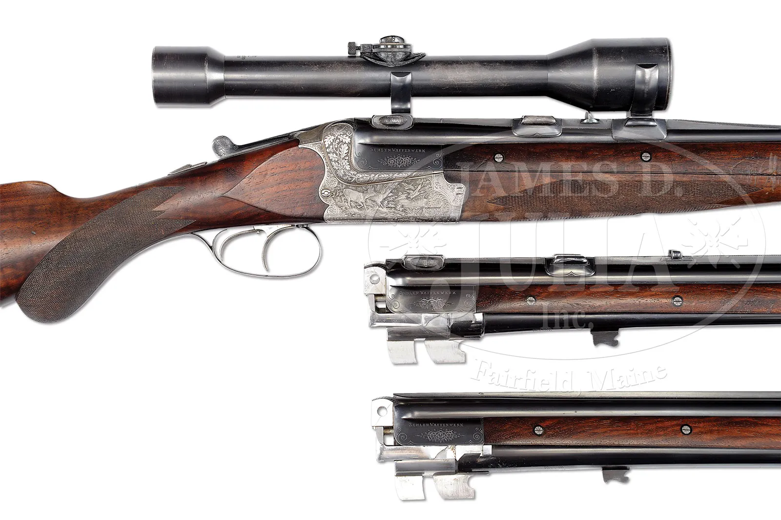 *HERMAN GOERING’S SUPERB MERKEL 201E OVER-UNDER BLITZ EJECTOR DOUBLE RIFLE WITH EXTRA RIFLE/ SHOTGUN AND DOUBLE SHOTGUN BARRELS, THREE SCOPES, IRONCLAD PROVENANCE, AND ORIGINAL CASE.SN 21158. Cal. 12 ga, 12 ga X 8x75R, 8x75R X 8x75R. 28-1/4″ OU shotgun bbls, 25-1/2″ rifle/ shotgun bbls, and 26″ double rifle bbls, are all of demi-bloc construction, Bohler steel, and are engraved “Gebruder Merkel Suhl” and “Suhler Waffenwerk” on breech ends, with some floral engraving. All are stamped with Suhl nitro proofs with date of August 1933. Rear lumps are stamped with Merkel logos. Double shotgun and rifle/shotgun bbls have full length solid matted ribs, and double rifle bbls have matted quarter rib and matted front sight base. Quarter rib of rifle bbls is fitted with three claw scope bases and a single standing U-notch rear sight. Rifle/ shotgun bbls have 2 claw bases and a rear sight which can be flipped up for rifle use. Sling loops are soldered to bottoms of bottom bbls. Coin finished ogee backed Blitz double Kersten OU action features non-automatic top tang safety (S inlaid in gold), pin type cocking indicators, and dbl triggers (front set). Action is engraved with near full coverage nicely cut simple scroll with some floral highlights on bottom surrounding well rendered game scenes as typical quarry for this combination gun; a roaring stag and two hinds in woodland are on left, with a roe deer and doe in foreground on right side; a pair of mallards flush from marsh in background. Reinforcing bolsters are exceptionally well relief engraved in acorn and oak leaves. Bottom of action is engraved “SUHLER WAFFENWERK” “D. R. P” “GEBRUDER MERKEL SUHL”. Steel trigger guard has more scroll on bow surrounding semi-relief engraved vignette of auerhahn calling while perched on branch. SN is on tang. Well marbled and lightly fiddle figured European walnut round knob pistol grip buttstock measures 14-3/8″ over beaded rib embossed horn buttplate with Merkel logo. Forends are of 3-pc design, with one bottom piece with ejector and Deeley release, servicing all three bbl sets. Bottom rear of this forend has inlet silver circle with high relief rendering of Goering’s well known crest, having raised mailed fist holding a ring. This is surmounted by a knight’s helm with surrounding acanthus scroll. Above the helm is another mailed fist flanked by wings signifying the Luftwaffe. Although not specified on ledger page, this crest plate has been in place for a very long time, as the amount of wear visible including continuation of scratches, grime, etc. is entirely commensurate with the remainder of gun. OU Shotgun: Bore diameter: top -.729, bottom – .729. Bore restrictions: top – .042 (full), bottom – .027 (mod). Wall thickness: top – .024, bottom – .021. Drop at heel: 3-1/16″, drop at comb: 1-9/16″. Cast 1/4″ off. Weight: 6 lbs. 8 oz. LOP: 14-3/8″. Rifle/ Shotgun BBLS: Bore diameter: top -.728. Bore restrictions: top – .046 (extra full)). Wall thickness: top – .023. Drop at heel: approx 3-3/16″, drop at comb: approx 1-3/4″. Weight: 7 lbs. 6 oz. LOP: 14-3/8″. DBL RIFLE BBLS: Drop at heel: approx 3-1/4″, drop at comb: approx 1-3/4″. Weight without scope: 8 lbs. 4 oz. LOP: 14-3/8″. This system comes with three scopes, all by Zeiss, with a 2-1/2 X Zielmar with crosshair and post reticle fitted to the rifle/ shotgun bbls; with a Zielvier with three post and small central dot reticle, as well as a Zielsechs with same reticle fitted to double rifle bbls. It is interesting to note that the Zielvier is the only scope mentioned on the ledger page, and is listed by SN. (There are some indecipherable later notes relating to telescopes.) Brown leather case with riveted on brass corners and central brass rectangle is lined in bluish green cloth, and has leather Merkel label in lid, and has correct partitions for each bbl set, action, and all three telescopes. Accessories include high quality green canvas and leather sling, and some cleaning brushes. There is also a yellow box of DWM 8 x 57R cartridges. PROVENANCE: Color scan of orig ledger page with orig specifications with red ink notation “Herman Goering” and with date 1933 outlined in red. Letter from Dick A. King, Col USA Retd to Mr. A. J. Flood in which he states “Mr. Grover Wilson of the Zellerbach Paper Co, Spokane, Wash. who was G-2 of the 3rd Infantry Division and I, as G-4, obtained all of Herman Goering’s guns in his home in the village of Berchtesgaden. It was quite an experience as Emma, Herman’s wife was there at the time. Since Grover was more interested in his cameras, liquor, etc; I naturally spent my time with the guns. I gave two to Maj. Gen Iron Mike O-Daniel commanding the division, Wilson has two, Iron Mike gave one to Gen. Eisenhower and one to Lt Gen Ham Haislip. I gave one to Charles E. Johnson who was chief of staff, and I kept the best 5.” “This combination was the only one with the English box leather fitted case, and by far the most valuable, as well as being Herman Goering’s favorite.” Orig “Certificate” relating to shipping of this combination gun and scopes back to US. Description of this rifle and appraisal value by R. L. Wilson. Various invoices and auction listings pertaining to this gun. Hand written note from past owner Hunter Von Leer relating his knowledge of the history of this gun, as well as a GUNS magazine article entitled “The Guns of Hunter Von Leer” where this gun is pictured and described. Encyclopedia Britannica information on Herman Goering, and a picture of Herman Goering carrying a rifle similar to this one. Various photographs of this rifle and some background information of Hunter Von Leer. Ex collections: Lt. Col. Dick A. King to Mr. A. J. Flood to Hunter Von Leer to Cherry’s to Richard “Stretch” Kennedy and through Amoskeag Auction Co to present consignor? CONDITION: Excellent, original, as found. Bbls retain over 90% orig blu